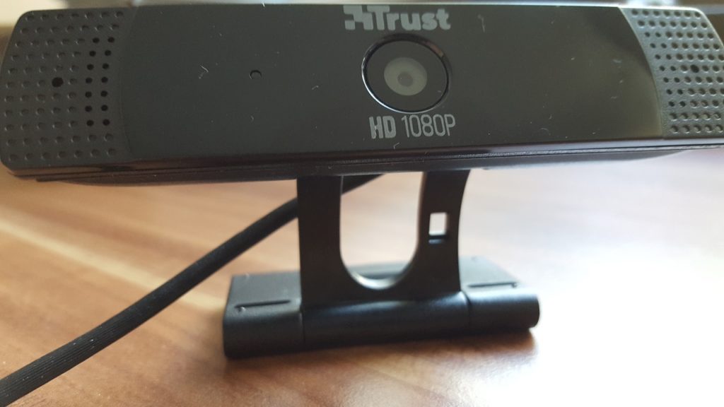 Schauen wir uns die Kamera etwas genauer an. Auf den ersten Blick ähnelt sie einer Logitech Webcam. Auf der Kamera ist das Herstellerlogo von Trust und die Auflösung zu finden. Die Linse ist mittig platziert und an den äußeren beiden Seiten sind die zwei Mikroöffnungen mit einzelnen kleinen Löchern. Hinter welcher der beiden Kunststoff-Abdeckungen sich das vereinzelte Mikrofon befindet, können wir nicht sagen. Links von der Linse finden wir einen kleinen Sensor, der ist für den Weißabgleich zuständig. Die Kamera ist aus Kunststoff gefertigt und weißt eine gute Verarbeitung auf. Der Boden, auf dem die Kamera steht, ist auf der Rückseite gummiert, um bei einer Montage am Monitor für einen sicheren Halt zu sorgen. Um die Kamera auf den Tisch zu stellen wird die untere Seite des Scharniers umgeklappt. Wieso diese Fläche nicht gummiert ist, wissen wir nicht, finden es aber schade.