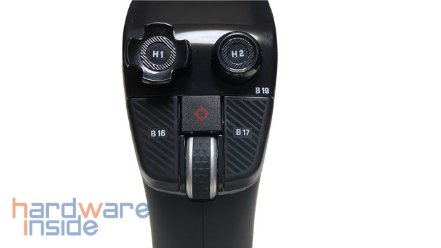 Oben auf dem Flightstick sind weitere Elemente für die Bedienung untergebracht. Direkt ins Auge fällt das LCD-Display, welches gut ein Drittel der oberen Fläche einnimmt. Darunter befinden sich ein 8-Wege-POV Stick mit dem z. B. die Cockpitansicht verändert werden kann und ein weiterer analoger Stick, um Kameraschwenks durchzuführen (H1 / H2). Im Daumenbereich sind rechts und links zwei Buttons (B16 / B17) angeordnet, sowie in der Mitte ein Scrollrad mit einer angenehm markanten Rasterung und darüber ein 1×1 cm großes Touchpad (mit Klickfunktion). Unter den Bedienelementen ist ein weiterer milchiger Streifen zu sehen. Auch dieser wird im Betrieb von LEDs beleuchtet. Damit bietet der VELOCITYONE Flightstick insgesamt 27 programmierbare Schaltflächen.