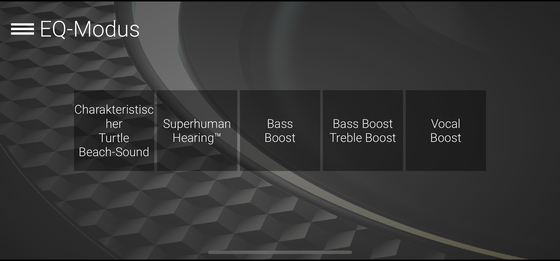 TURTLE BEACH bietet auch eine separate App an, die via Bluetooth z. B. mit dem Smartphone (für Android und IOS) verbunden wird. Über die App lassen sich alle Einstellungen schnell und einfach vornehmen. Dafür stehen fünf verschiedene Menüs zur Verfügung. So können die Totzonen, die Beleuchtung, die Empfindlichkeit, Ausrichtung (Links- oder Rechtshänder) und im EQ-Modus die Audioparameter angepasst werden.