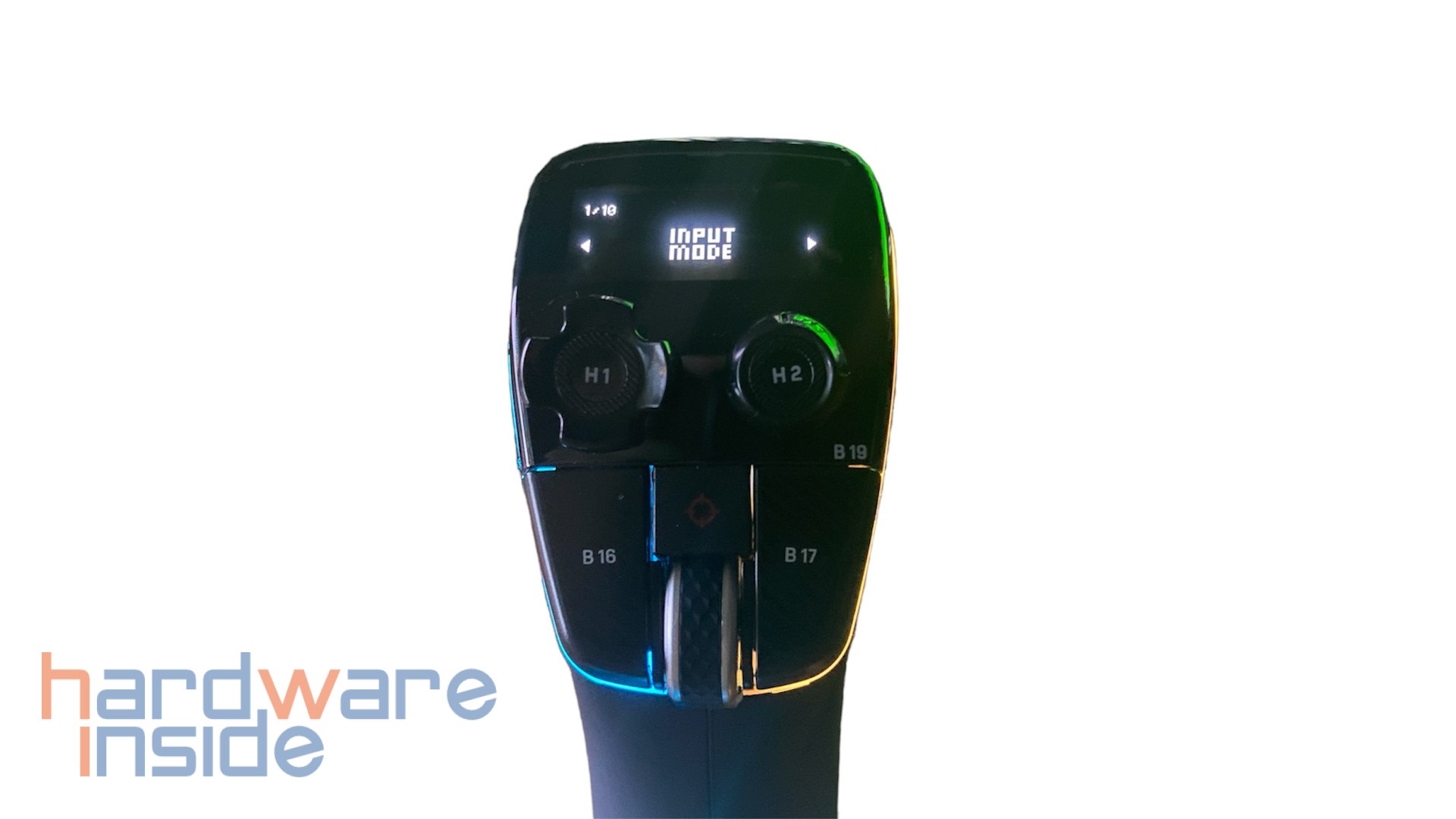 Oben auf dem Flightstick sind weitere Elemente für die Bedienung untergebracht. Direkt ins Auge fällt das LCD-Display, welches gut ein Drittel der oberen Fläche einnimmt. Darunter befinden sich ein 8-Wege-POV Stick mit dem z. B. die Cockpitansicht verändert werden kann und ein weiterer analoger Stick, um Kameraschwenks durchzuführen (H1 / H2). Im Daumenbereich sind rechts und links zwei Buttons (B16 / B17) angeordnet, sowie in der Mitte ein Scrollrad mit einer angenehm markanten Rasterung und darüber ein 1×1 cm großes Touchpad (mit Klickfunktion). Unter den Bedienelementen ist ein weiterer milchiger Streifen zu sehen. Auch dieser wird im Betrieb von LEDs beleuchtet. Damit bietet der VELOCITYONE Flightstick insgesamt 27 programmierbare Schaltflächen.