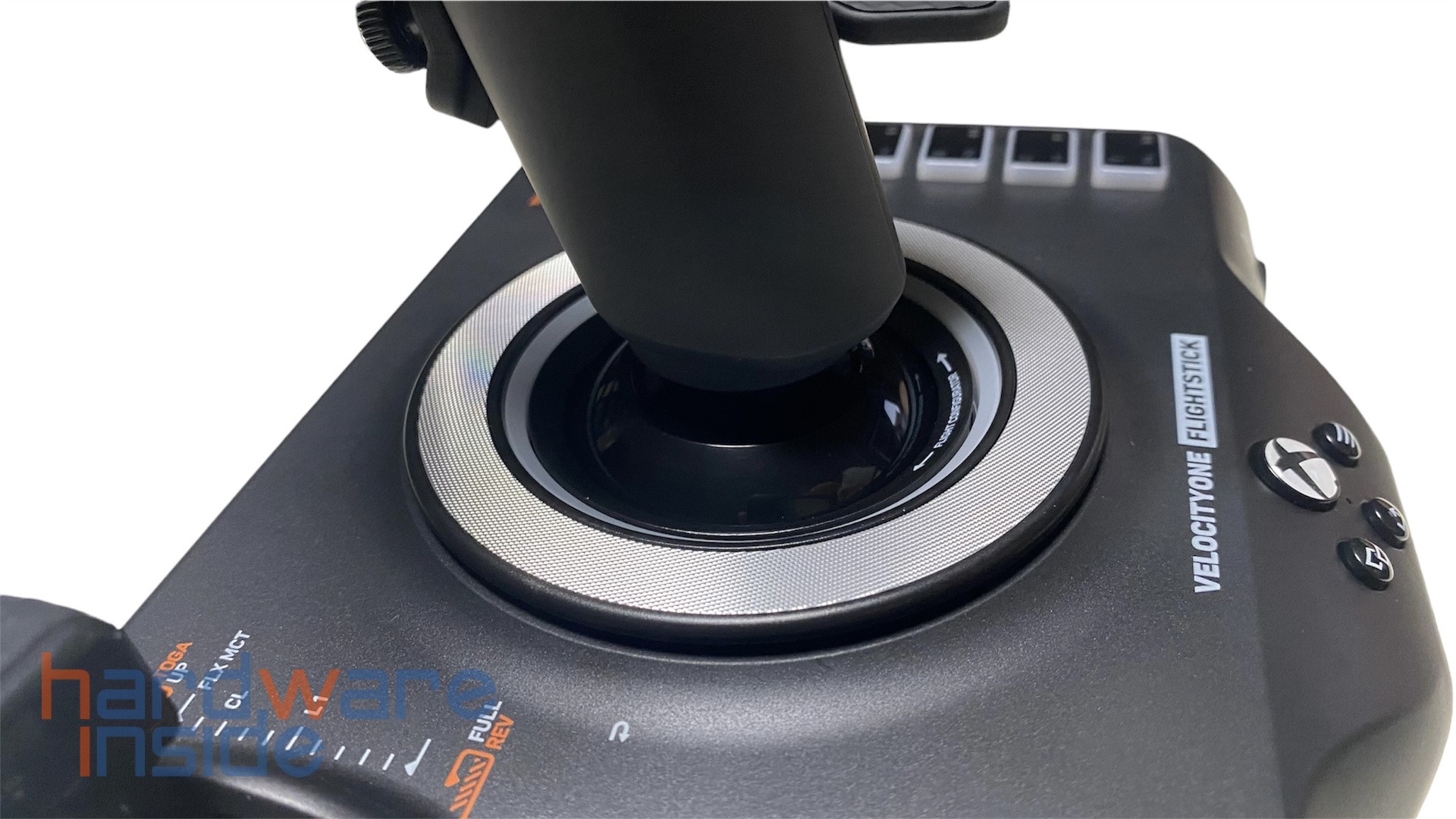 In der Mitte ist ein großer runder Ring (Flight Configurator) aus Metall um die Stick-Mulde platziert. Der Ring ist drehbar und besitzt auf der rechten und linken Seite jeweils eine Tasten-Funktion. Zusätzlich ist der Ring auch auf der Innenseite mit einer LED-Beleuchtung ausgestattet, die unter einem milchigen Diffusor verbaut ist.