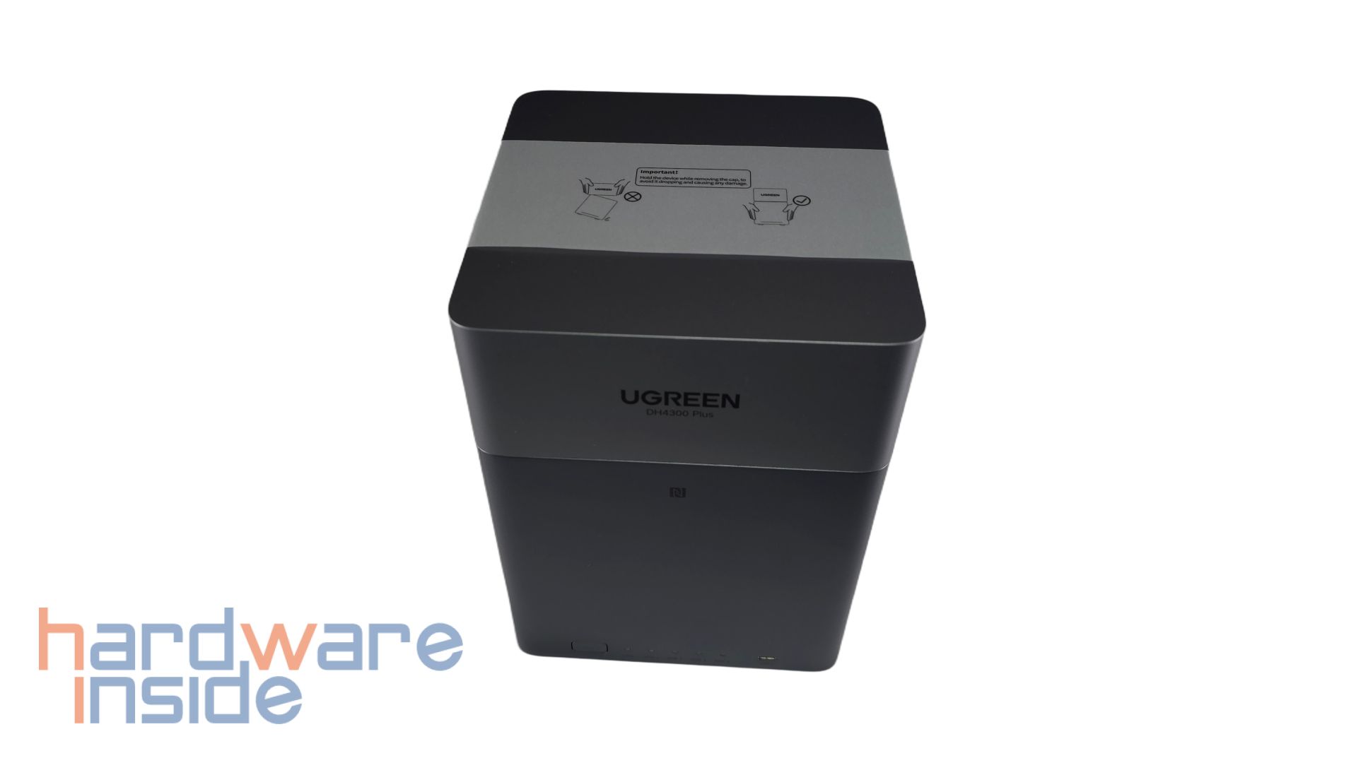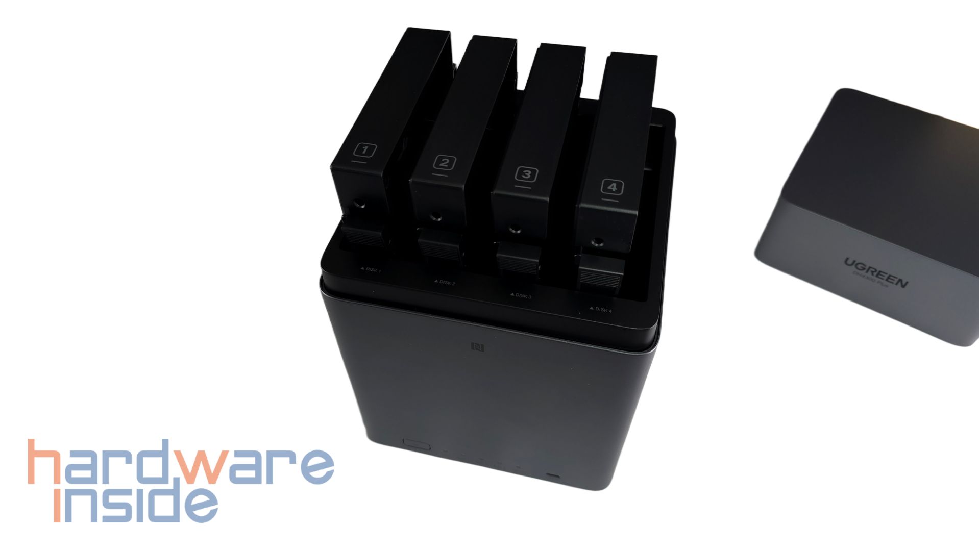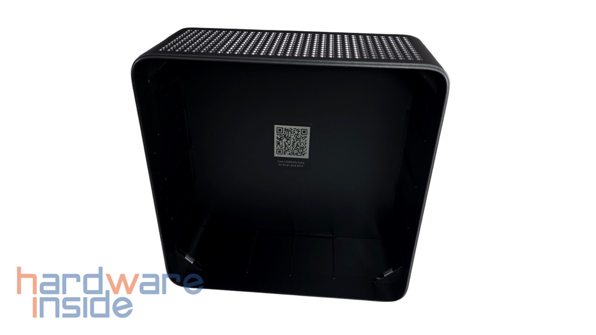 Der Deckel kann leicht angehoben werden und im Inneren ist zu sehen, dass vier Magnete in jeder Ecke den Deckel an dem inneren Korpus halten. Im Inneren des Deckels ist außerdem ein QR-Code geklebt, der auf die UGREEN NAS App verweist. Nach der Abnahme des Deckels sind vier nummerierte Einschübe zu sehen. Auch auf dem inneren Korpus sind die Plätze der Einschübe nummeriert. Zudem ist der innere Korpus samt der Einschübe in Schwarz gehalten.