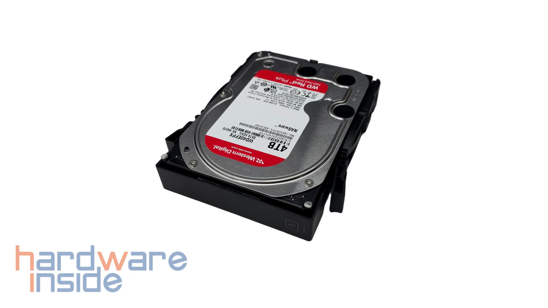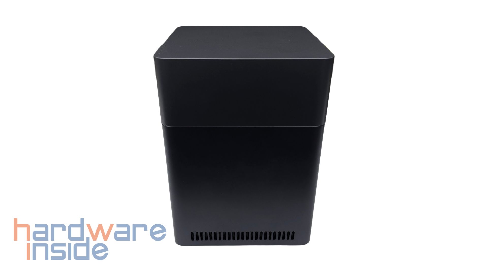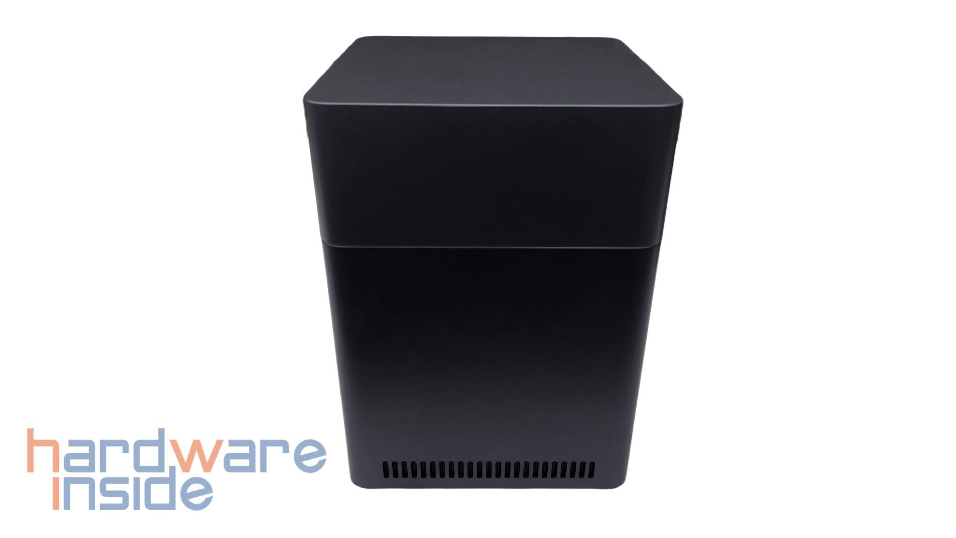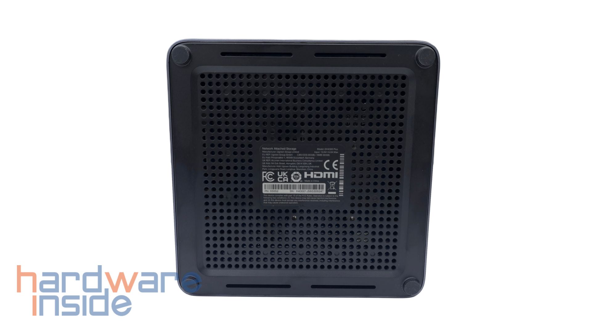 Der Deckel kann leicht angehoben werden und im Inneren ist zu sehen, dass vier Magnete in jeder Ecke den Deckel an dem inneren Korpus halten. Im Inneren des Deckels ist außerdem ein QR-Code geklebt, der auf die UGREEN NAS App verweist. Nach der Abnahme des Deckels sind vier nummerierte Einschübe zu sehen. Auch auf dem inneren Korpus sind die Plätze der Einschübe nummeriert. Zudem ist der innere Korpus samt der Einschübe in Schwarz gehalten.