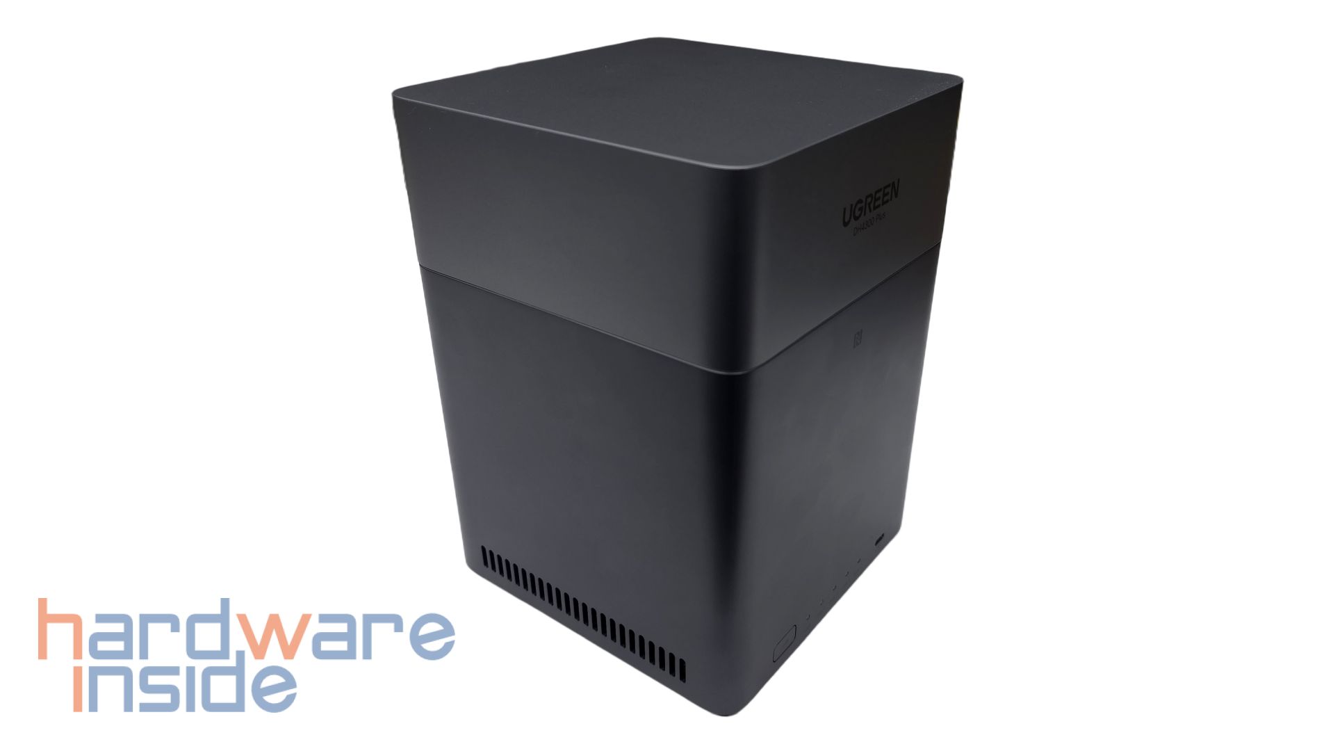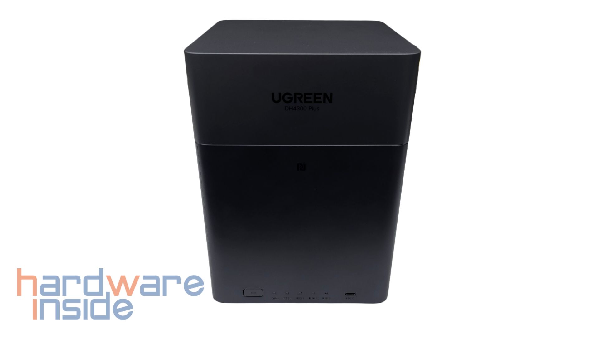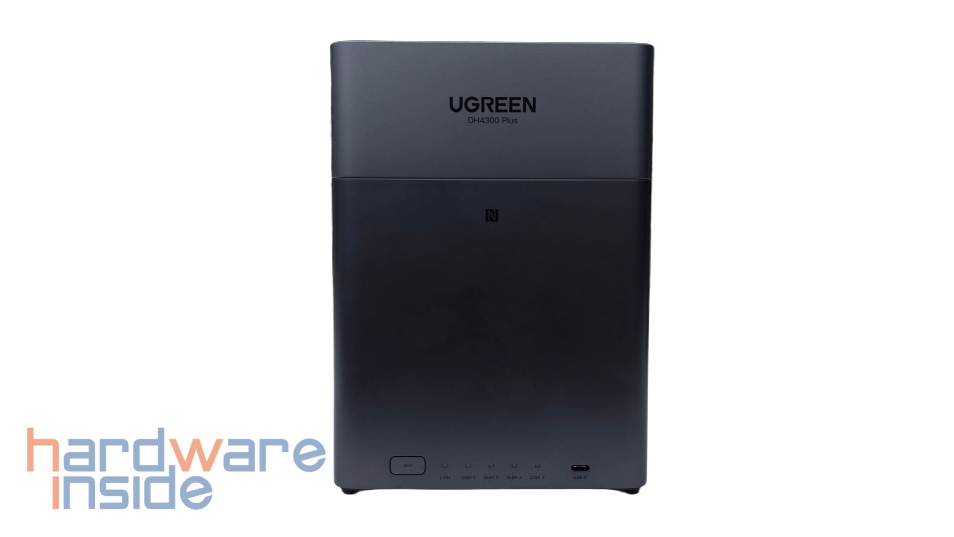 Das UGREEN NASync DH4300 Plus ist ein NAS-System mit vier Einschüben für 2,5- oder 3,5-Zoll Festplatten. Das Gehäuse besteht aus einer Schale mit matter Oberfläche aus stabilem Kunststoff, getrennt in zwei Teilen in grauer Farbe und wiegt etwa 1,6 kg ohne Bestückung der Festplatten. Der obere Teil, der etwa ein Drittel des Körpers einnimmt, ist geringfügig heller, als der Rest der Oberfläche. Frontal ist ein Schriftzug des Herstellers UGREEN und der Modellname DH4300 Plus in dem Deckel eingearbeitet. Weiter unten ist ein kleines NFC-Symbol zu finden und an der Unterkante der Front befindet sich der Einschaltknopf und einige LEDs, sowie ein USB-C-Anschluss. Die rechte und die linke Seite des Gehäuses tragen an der unteren Kante sauber gefräste Langlöcher zur Belüftung. Der Deckel ist an der Rückseite perforiert, sodass ein Luftstrom zur Kühlung entstehen kann. An der Unterkante der Rückseite sind die Anschlüsse untergebracht. Von links nach rechts sind hier ein HDMI-Anschluss, zwei USB-3.2-Anschlüsse, ein RJ45-Ethernet-Anschluss, ein kleiner RESET-Knopf und eine DC-12-Volt Stromversorgung untergebracht. An der Unterseite sind vier Gummifüße mit einer Anti-Rutsch-Wirkung angebracht, die zudem das Gehäuse anheben, sodass der Lüfter im Inneren einen Luftaustausch erwirken kann.
