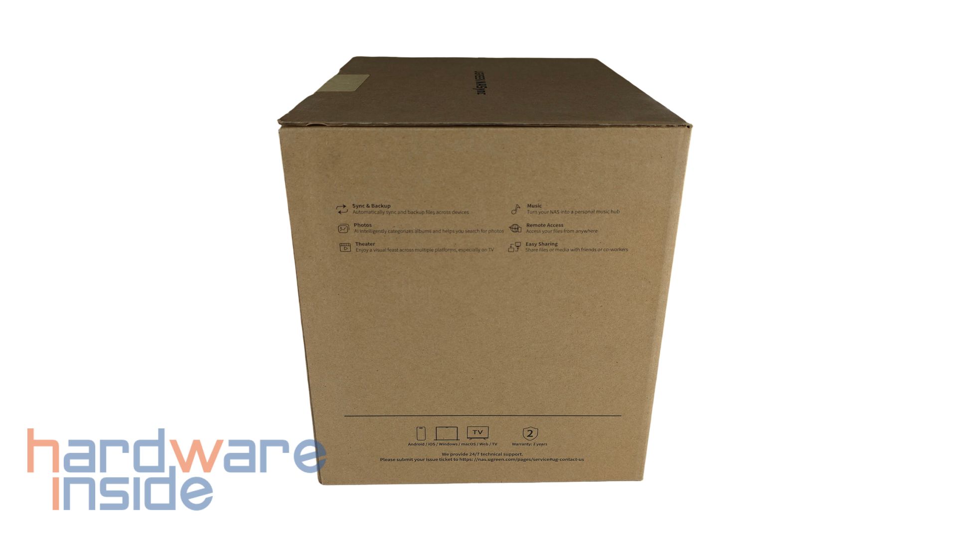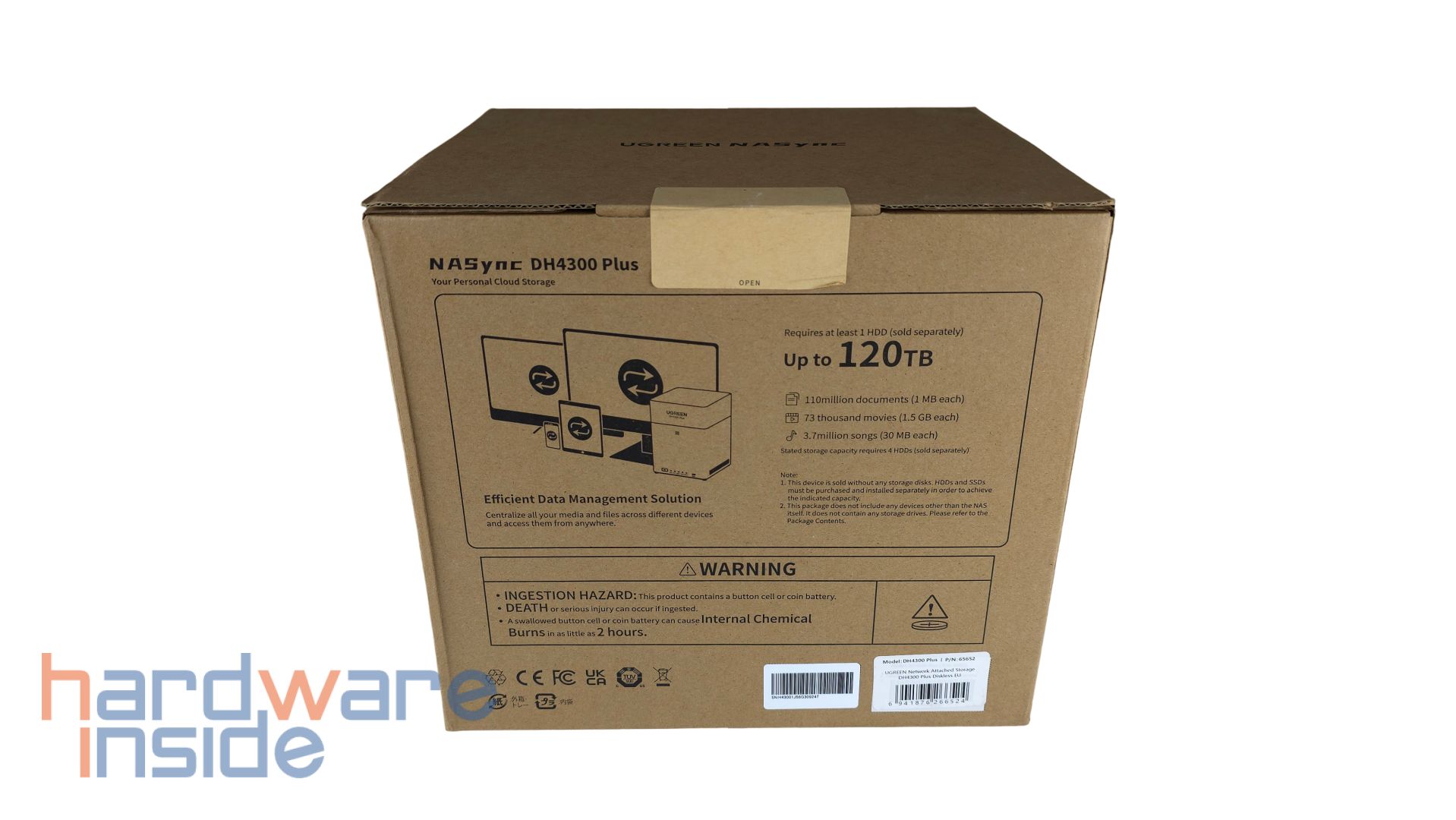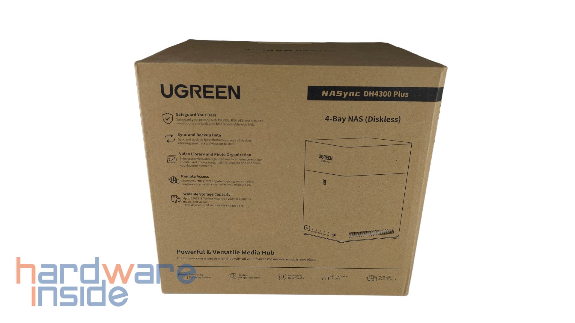 Das UGREEN NASync DH4300 Plus kommt bei uns in einem schlichten Karton an. Frontal ist eine Skizze des NAS unterhalb des Modellnamens abgebildet. Unter dem Hersteller-Schriftzug befinden sich einige Features. Ein Hinweis verdeutlicht einen Standard-Versand ohne Datenträger. An einer Seite ist eine Tabelle mit technischen Daten, Batterie- und Warnhinweisen zu finden. Die Rückseite verdeutlicht eine Nutzung des NAS mit verschiedenen Geräten wie Computern, Notebooks, Tablets und Smartphones. Neben weiteren Warnhinweisen ist eine mögliche Bestückung auf bis zu 120 Terrabyte ersichtlich. Eine weitere Seite der Verpackung zeigt ein paar Features der UGREEN NAS Software wie die automatische Synchronisation, KI-unterstützte Foto-App, Video-Abspielmöglichkeiten über verschiedene Plattformen, Musik-Hub, Fernsteuerung und leichtes Teilen der Daten.
