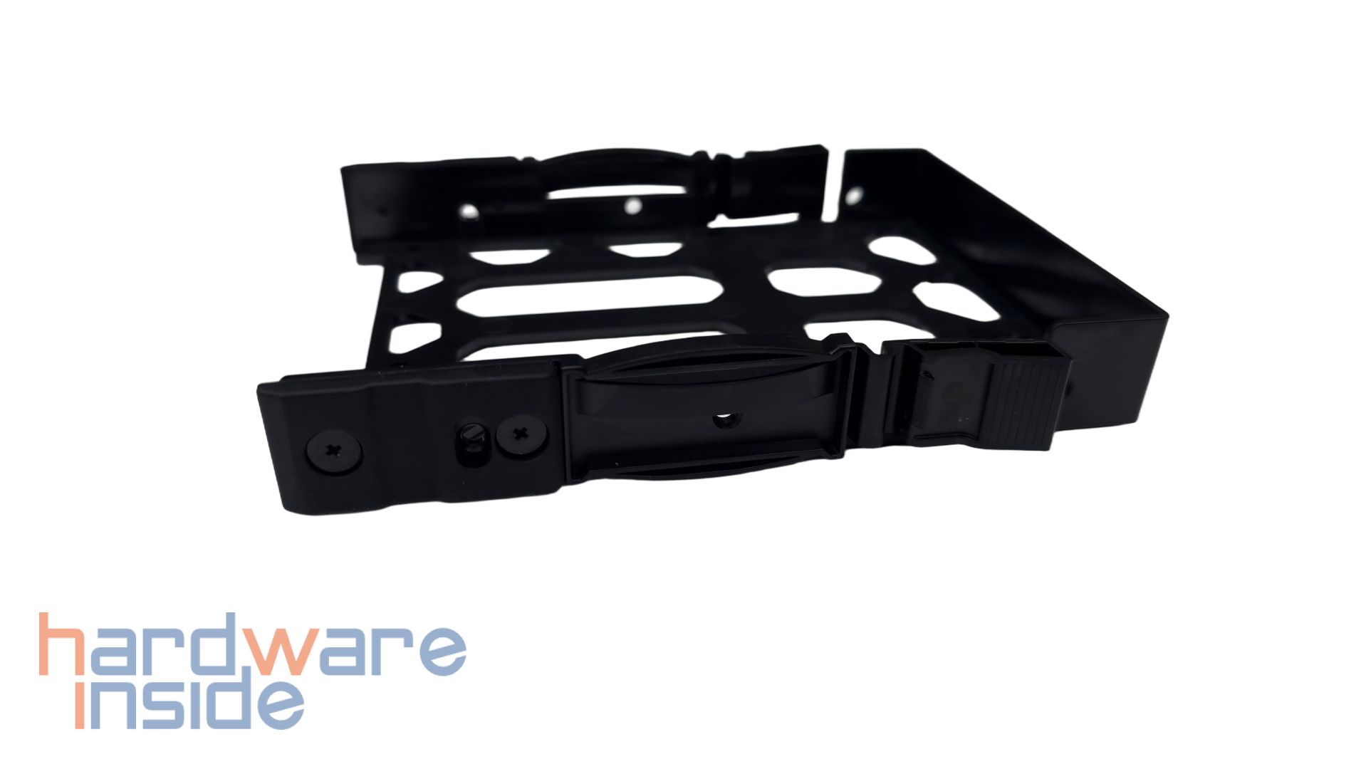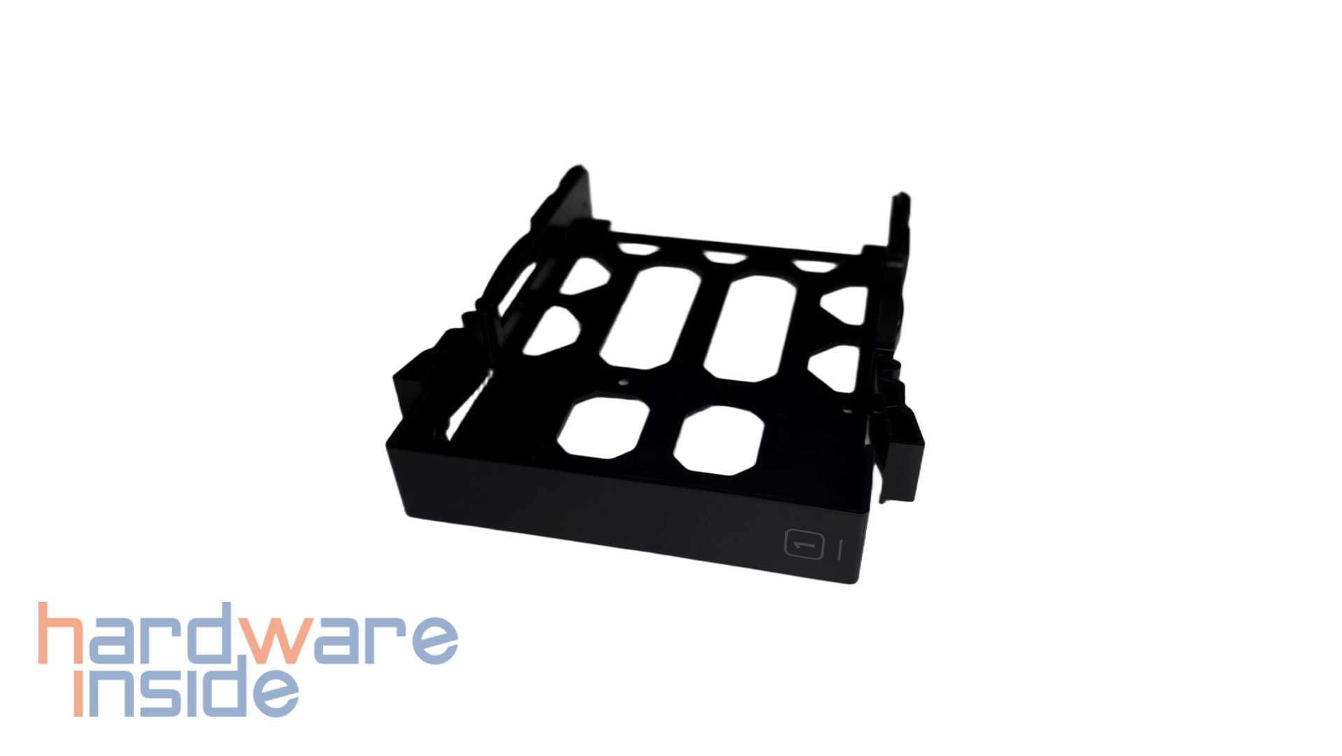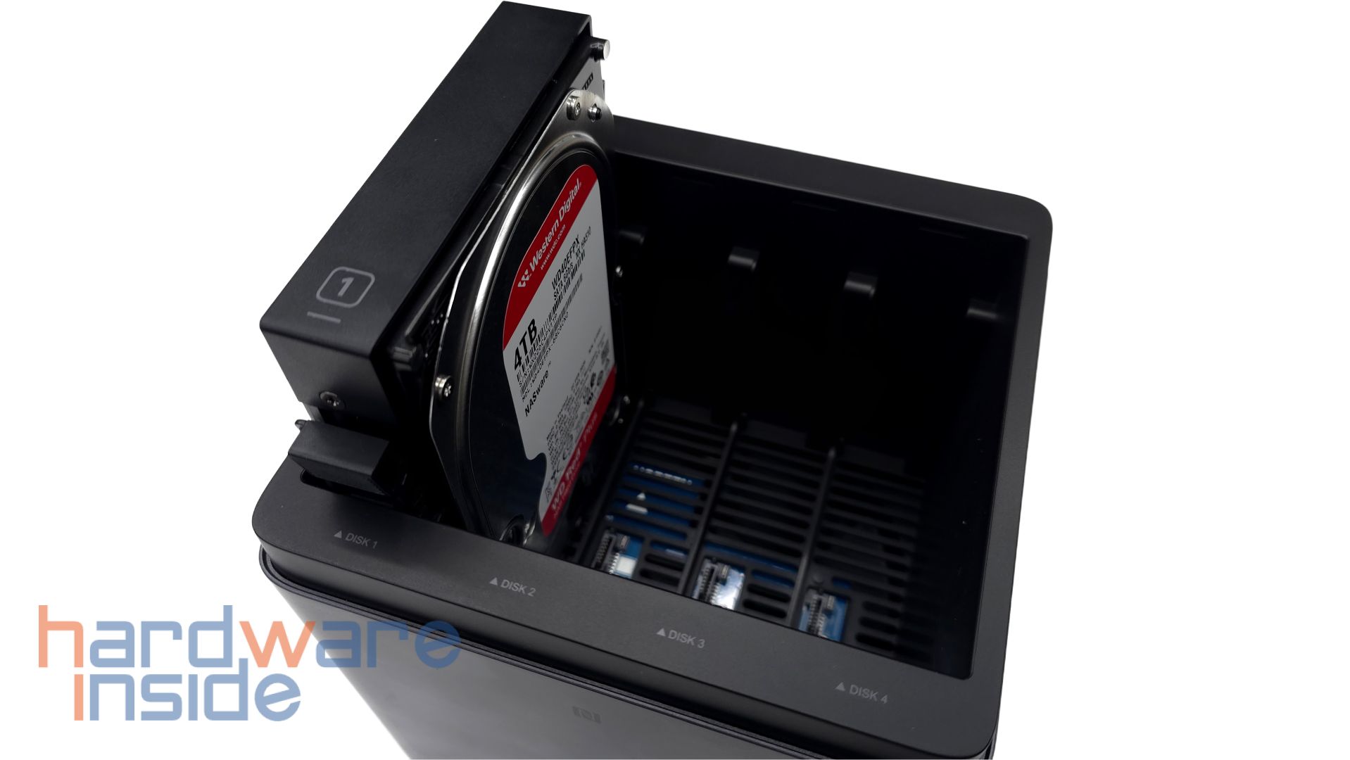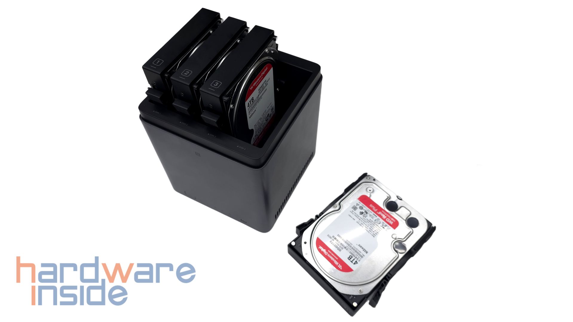 Die Einschübe, die unter dem Deckel hervorkommen, haben ein schwarzes Design und bestehen aus Kunststoff. Frontal ist eine Nummer auf jedem Einschub aufgetragen. An den Kanten der Einschübe sind geriffelte Hebel platziert, die elastisch geformt sind. Am hinteren Ende sind gummierte Flächen auf den Einschüben aufgeschraubt, die ein Einsetzen in das NAS stabilisieren. Ebenfalls an den Kanten befinden sich jeweils drei Bohrungen, in denen später die Datenträger mit den mitgelieferten Schrauben fixiert werden. Hier können 3,5-Zoll-Datenträger platziert werden, wobei eine maximale Speichererweiterung von bis zu 120 TB möglich ist. 2,5-Zoll-Datenträger werden an die Bohrungen an dem Boden der Einschübe befestigt.