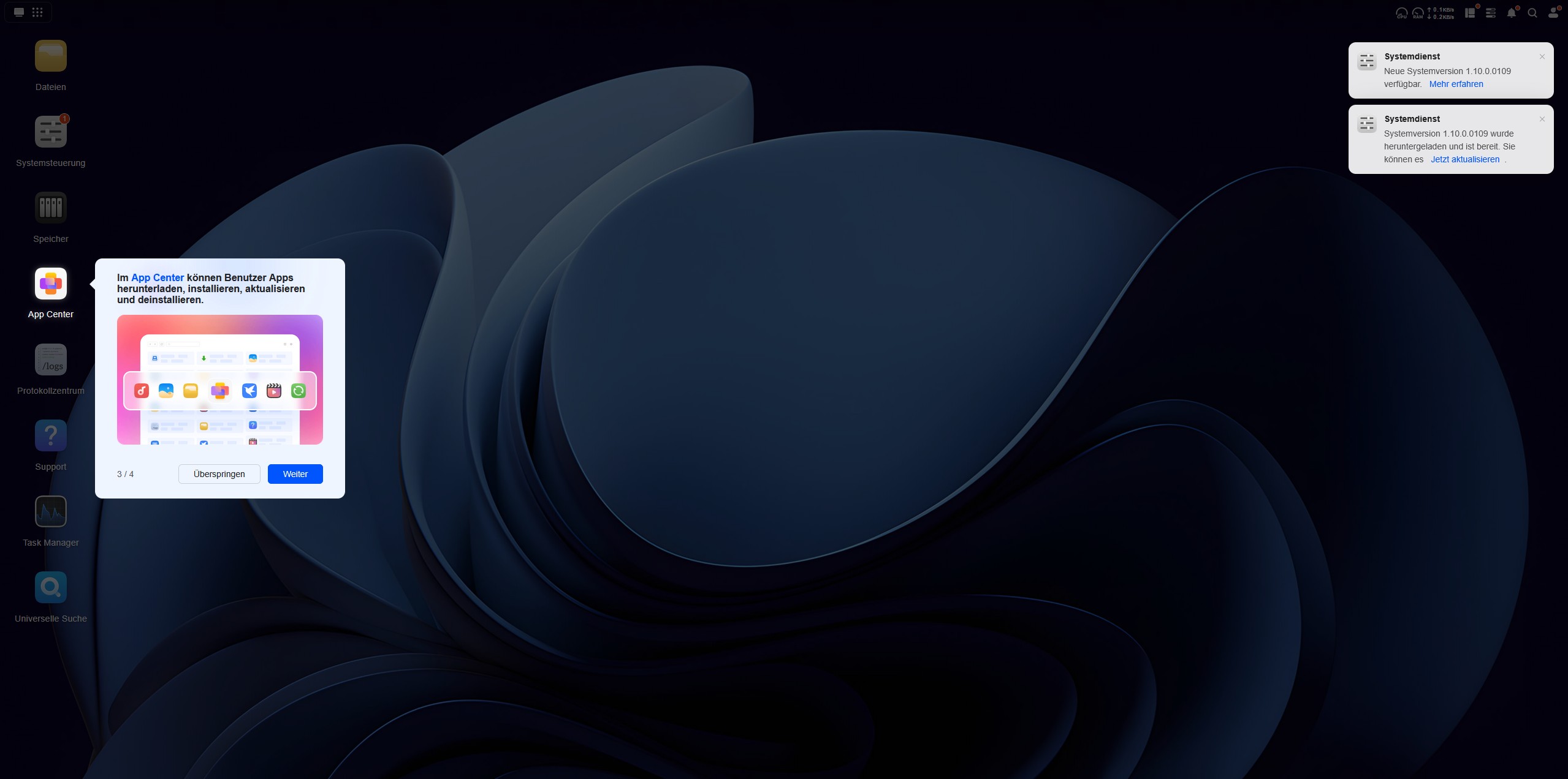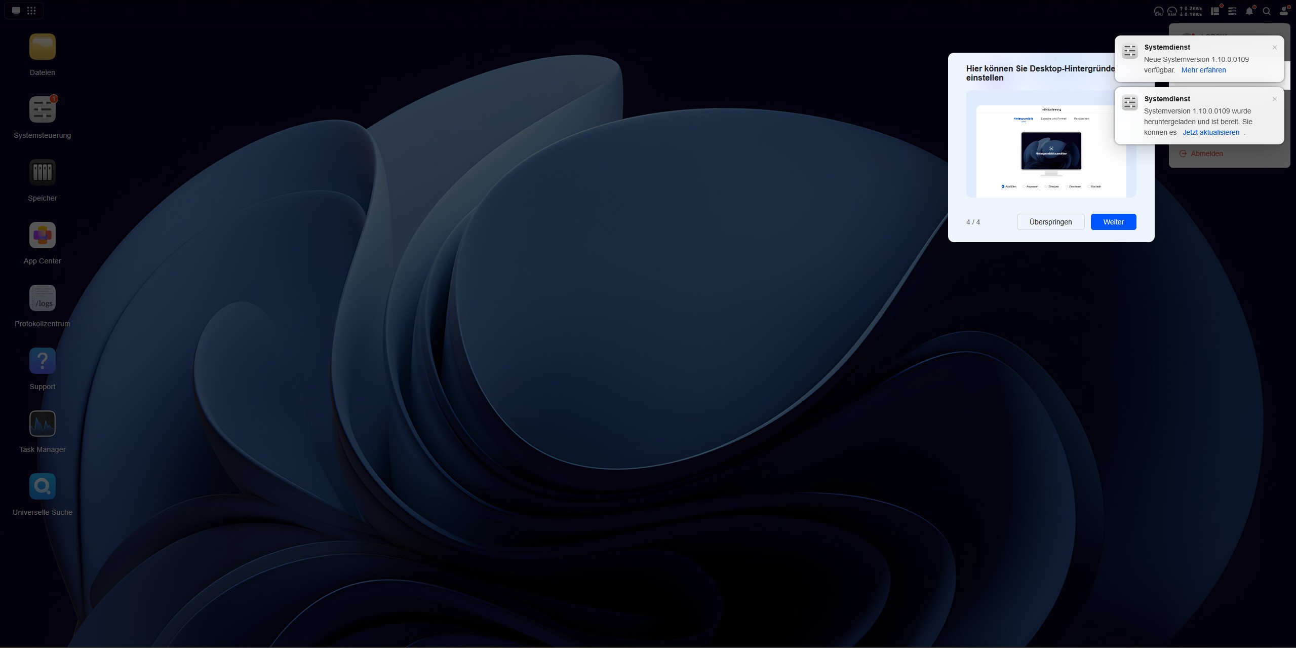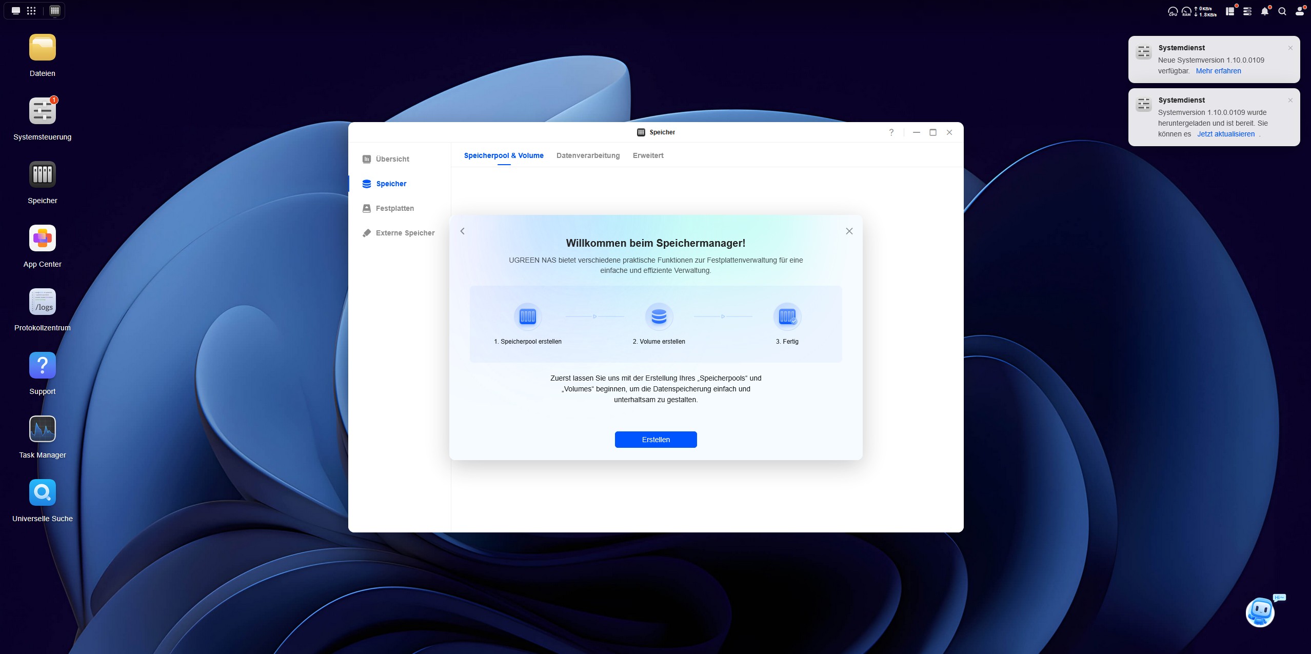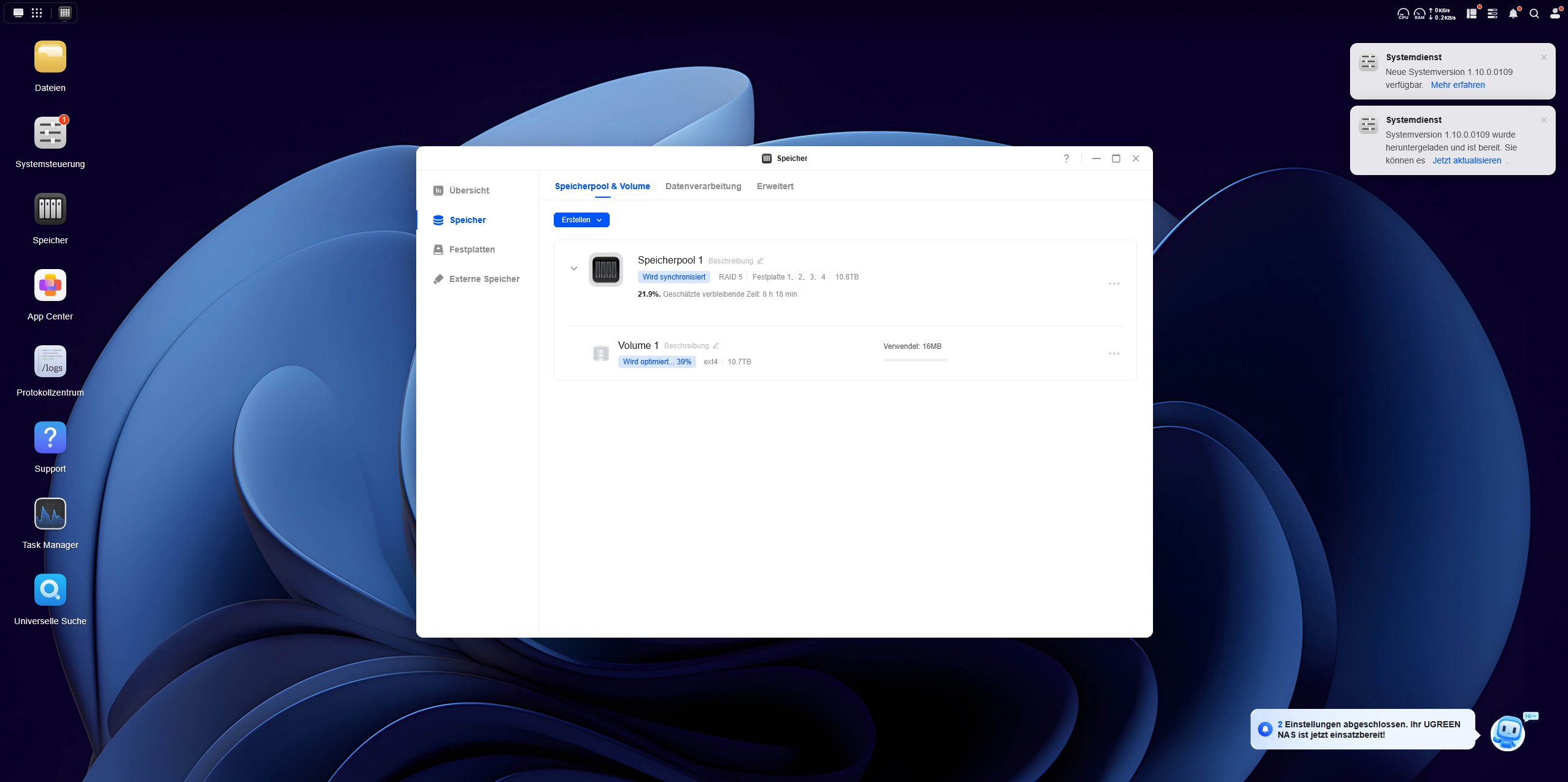 Das Betriebssystem des UGREEN NASync DH4300 Plus ist fortschrittlich und nicht nur ein simples Datengrab. Der Desktop des UGOS Betriebssystems wirkt schon auf den ersten Blick aufgeräumt. Unter UGOS versteht man das Ugreen-Operation-System und es läuft auf der Systemversion 1.10.0.0109. Das UGOS basiert auf einem Linux-Kernel und ist eine speziell angepasste Distribution, die für das NAS-System optimiert wurde. UGOS wurde in den letzten Jahren stark weiterentwickelt und bietet mittlerweile viele Features wie verbesserte Backup-Optionen, optimierte Docker-Integration und stabilere Netzwerkfunktionen. Es bietet Unterstützung für zehn Speicherformate und fünf Protokolle wie beispielsweise SMB, NFS und FTP, wodurch es flexibel in Netzwerken eingebunden werden kann.