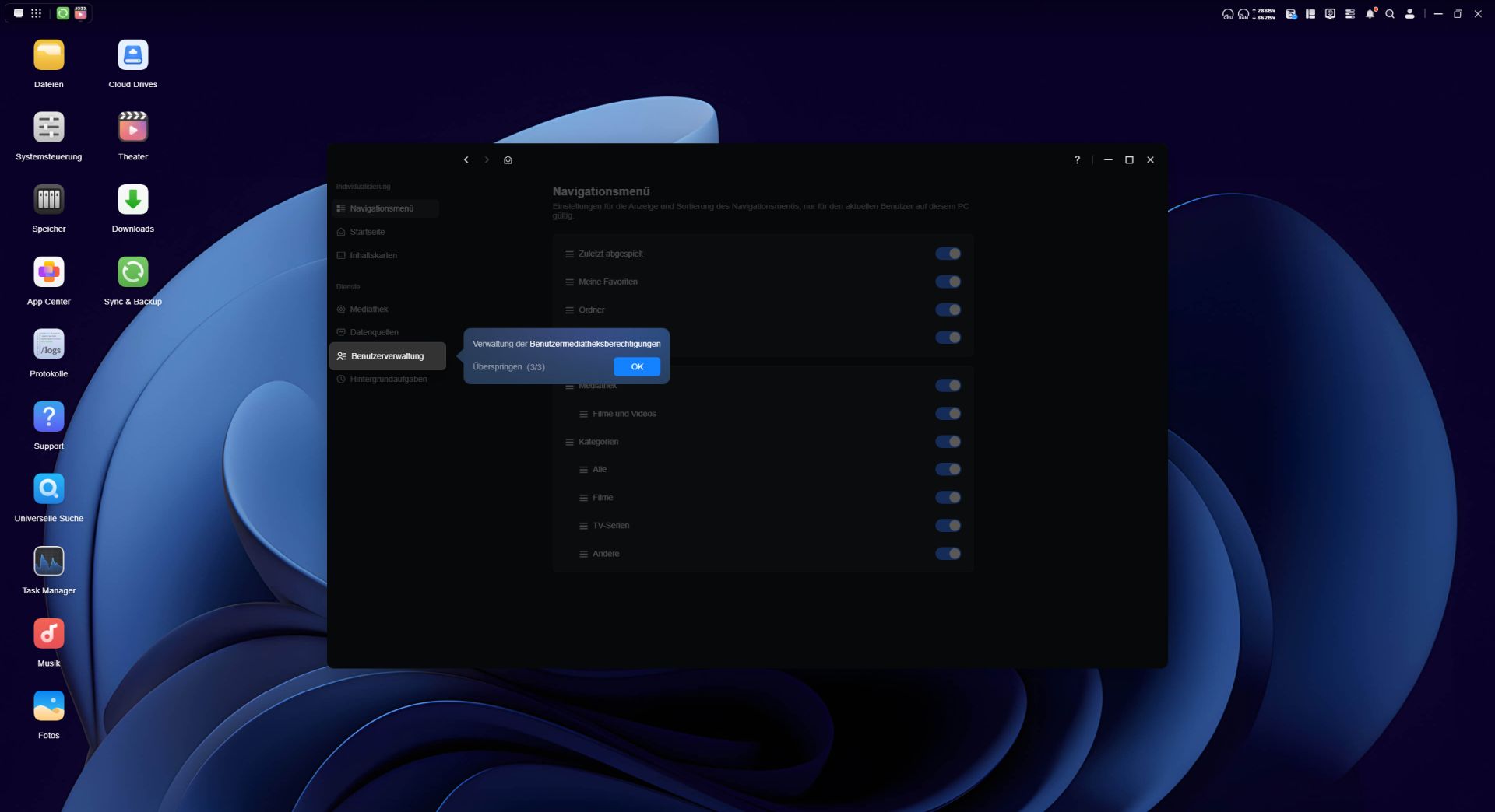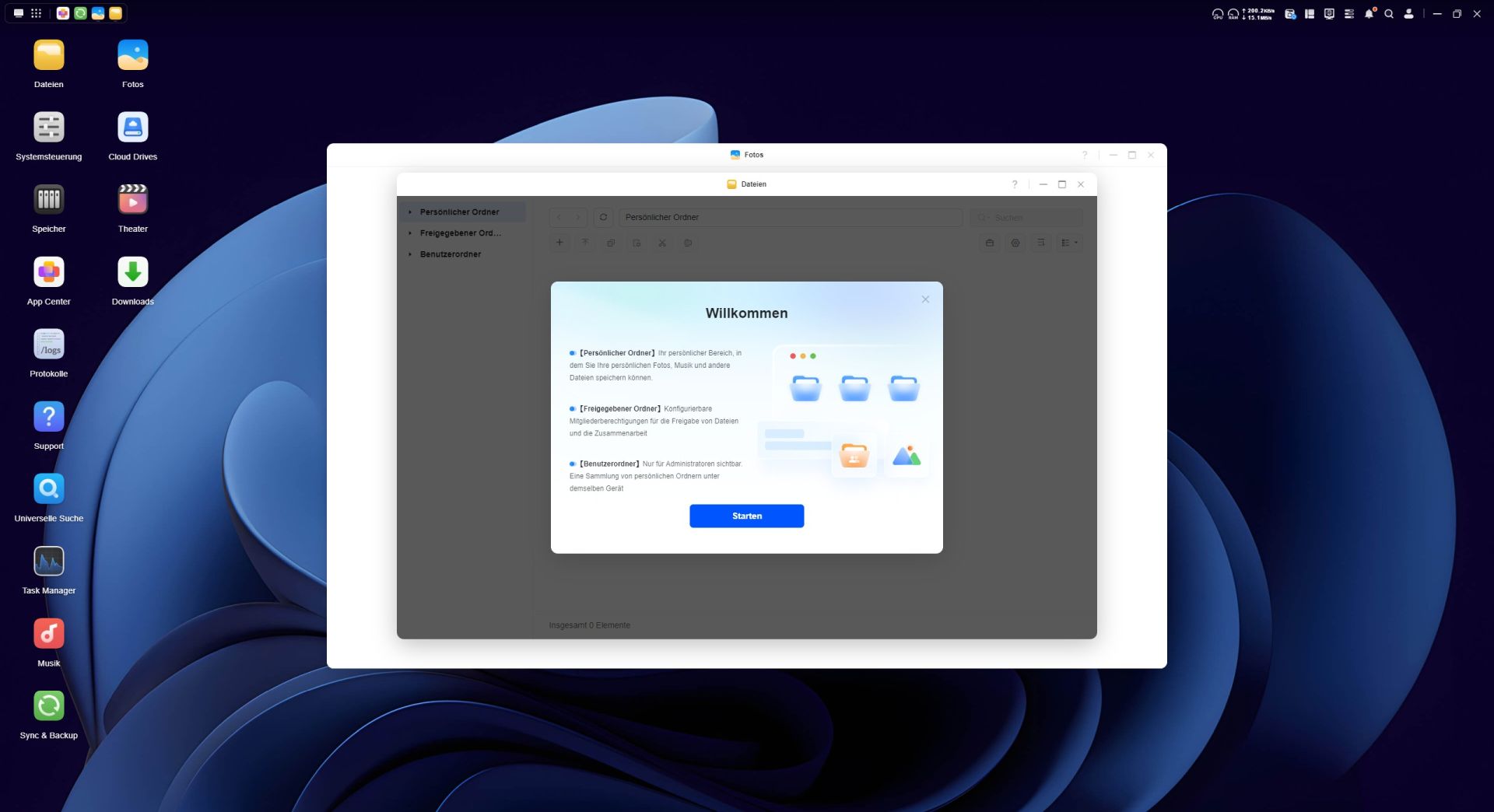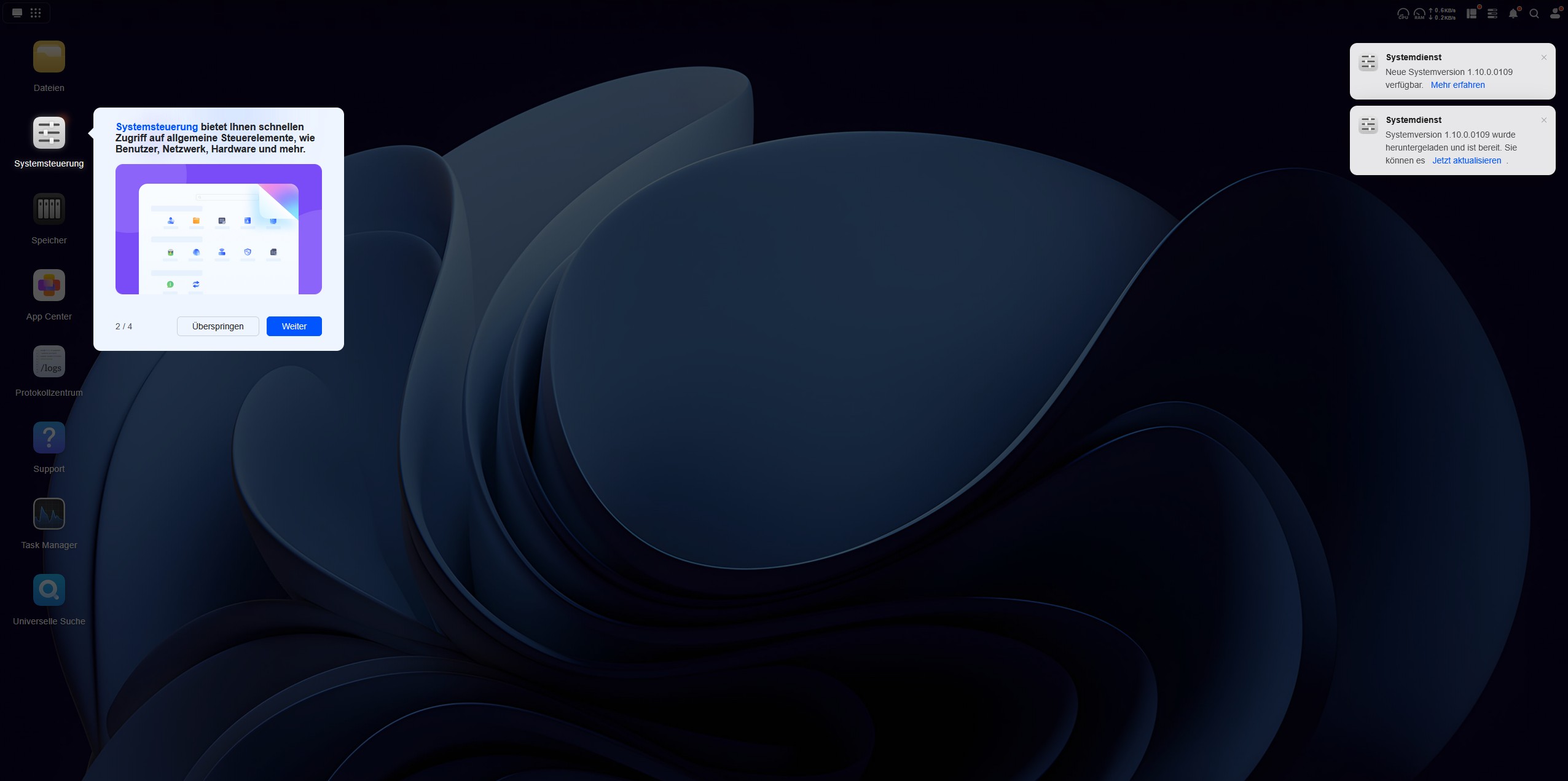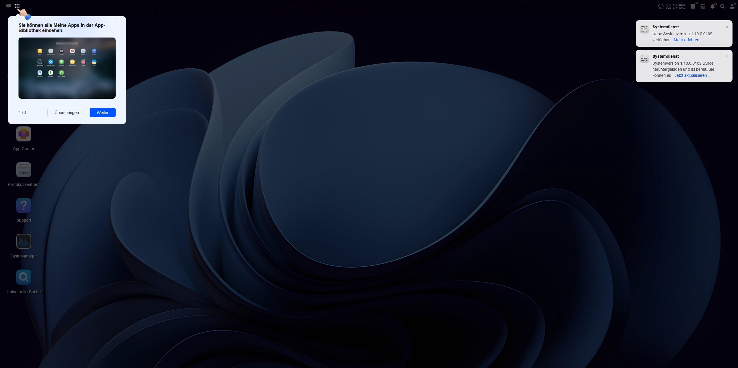Das Betriebssystem des UGREEN NASync DH4300 Plus ist fortschrittlich und nicht nur ein simples Datengrab. Der Desktop des UGOS Betriebssystems wirkt schon auf den ersten Blick aufgeräumt. Unter UGOS versteht man das Ugreen-Operation-System und es läuft auf der Systemversion 1.10.0.0109. Das UGOS basiert auf einem Linux-Kernel und ist eine speziell angepasste Distribution, die für das NAS-System optimiert wurde. UGOS wurde in den letzten Jahren stark weiterentwickelt und bietet mittlerweile viele Features wie verbesserte Backup-Optionen, optimierte Docker-Integration und stabilere Netzwerkfunktionen. Es bietet Unterstützung für zehn Speicherformate und fünf Protokolle wie beispielsweise SMB, NFS und FTP, wodurch es flexibel in Netzwerken eingebunden werden kann.