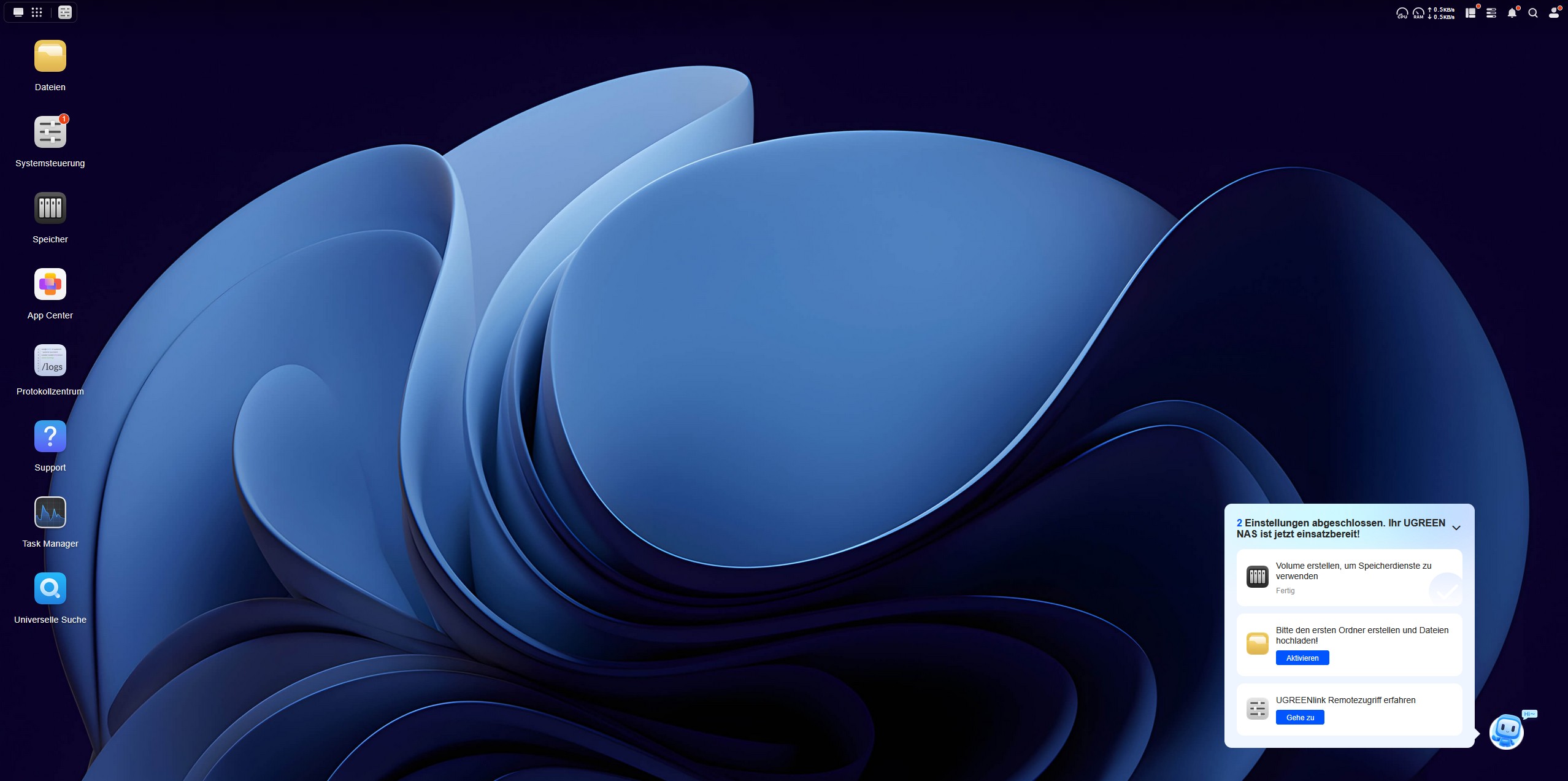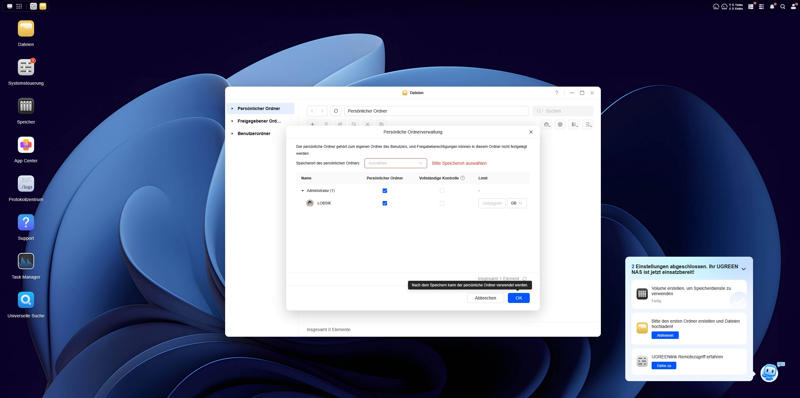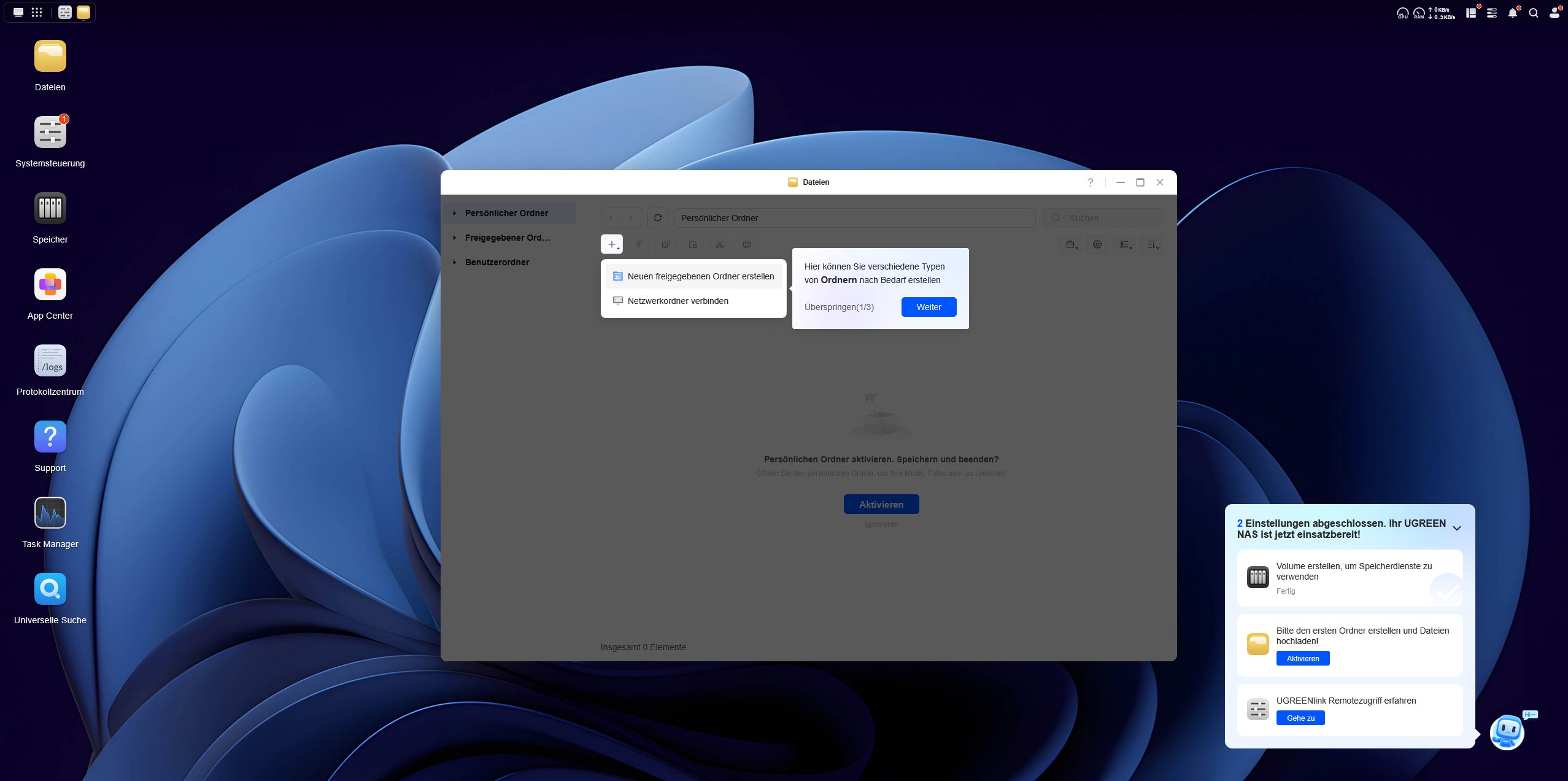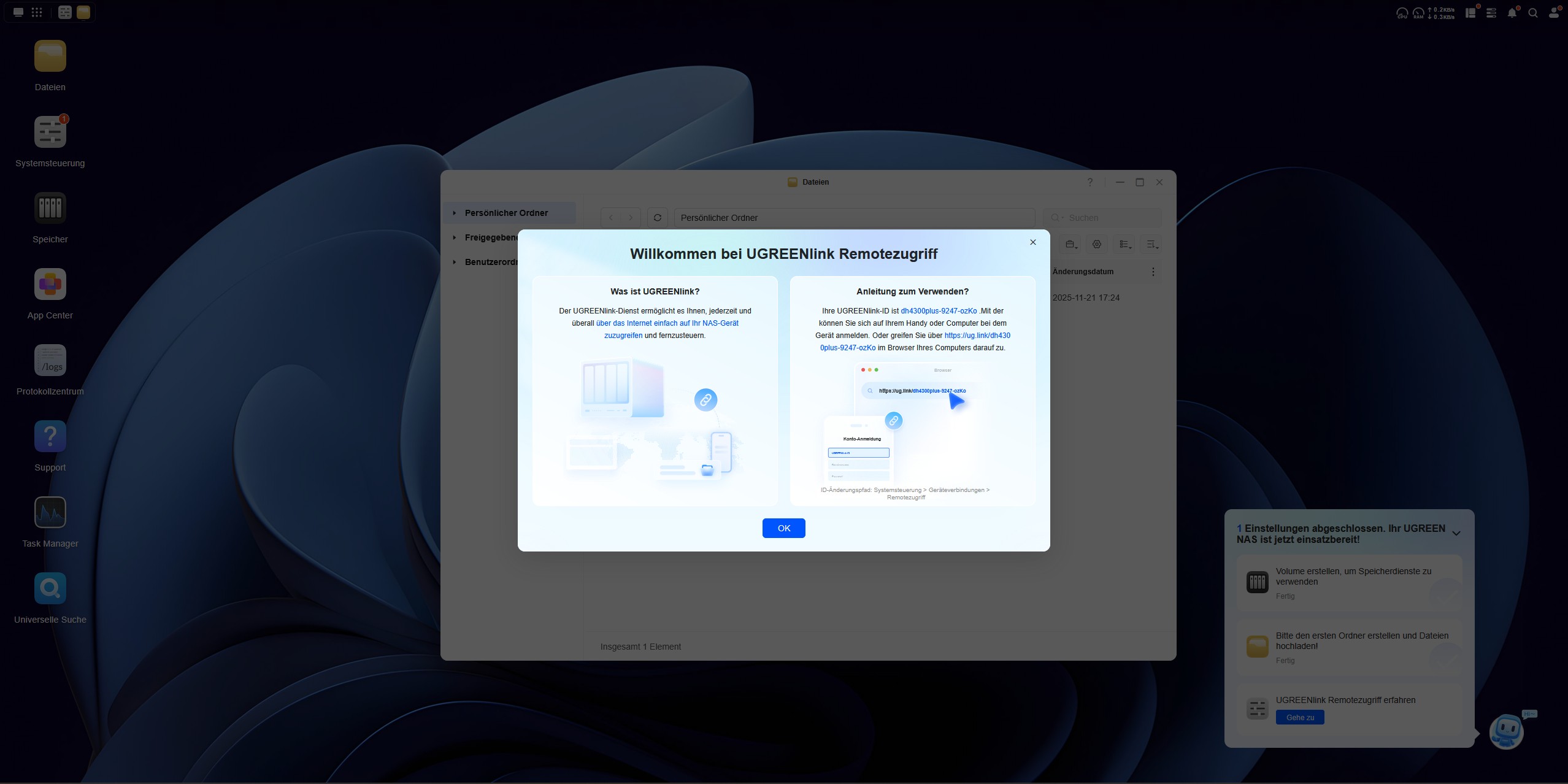 Als nächstes kümmern wir uns um die Einrichtung des ersten Ordners, in den wir Daten hochladen und synchronisieren können. Hierzu führt uns ein kleiner Chatbot in der rechten unteren Ecke durch die Einrichtung in drei Schritten. Im dritten Schritt verbinden wir unsere E-Mail mit dem UGREEN Service, um einen Remote-Zugriff auf das NAS-System zu erhalten. An dieser Stelle wird das NAS über das Internet erreichbar und wir müssen dem Service des chinesischen Herstellers UGREEN vertrauen. Als letzten Schritt der Einrichtung erstellen wir eine Zwei-Faktor-Authentifizierung über den Google Authenticator, auch wenn der Microsoft Authenticator vorgeschlagen wird. Ist die Einrichtung abgeschlossen, checken wir das System noch auf Updates, erneuern die Software und überprüfen über die Mitteilungszentrale alle erfolgten Schritte mit Zeitstempel. Nun ist das System einsatzbereit.