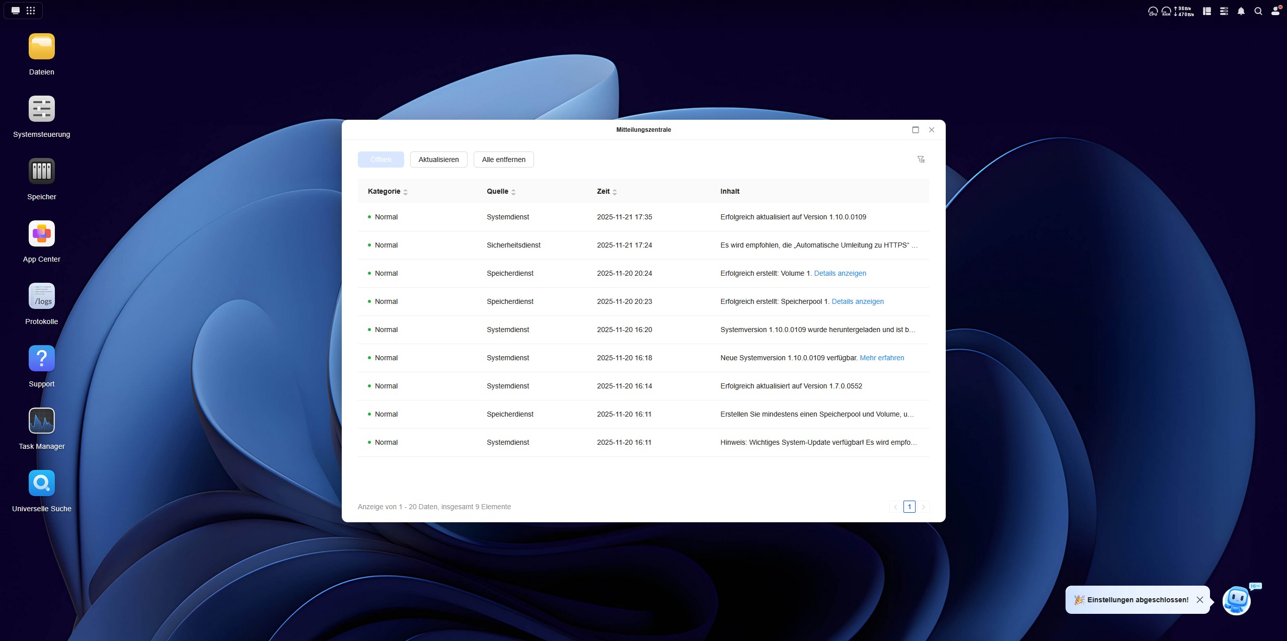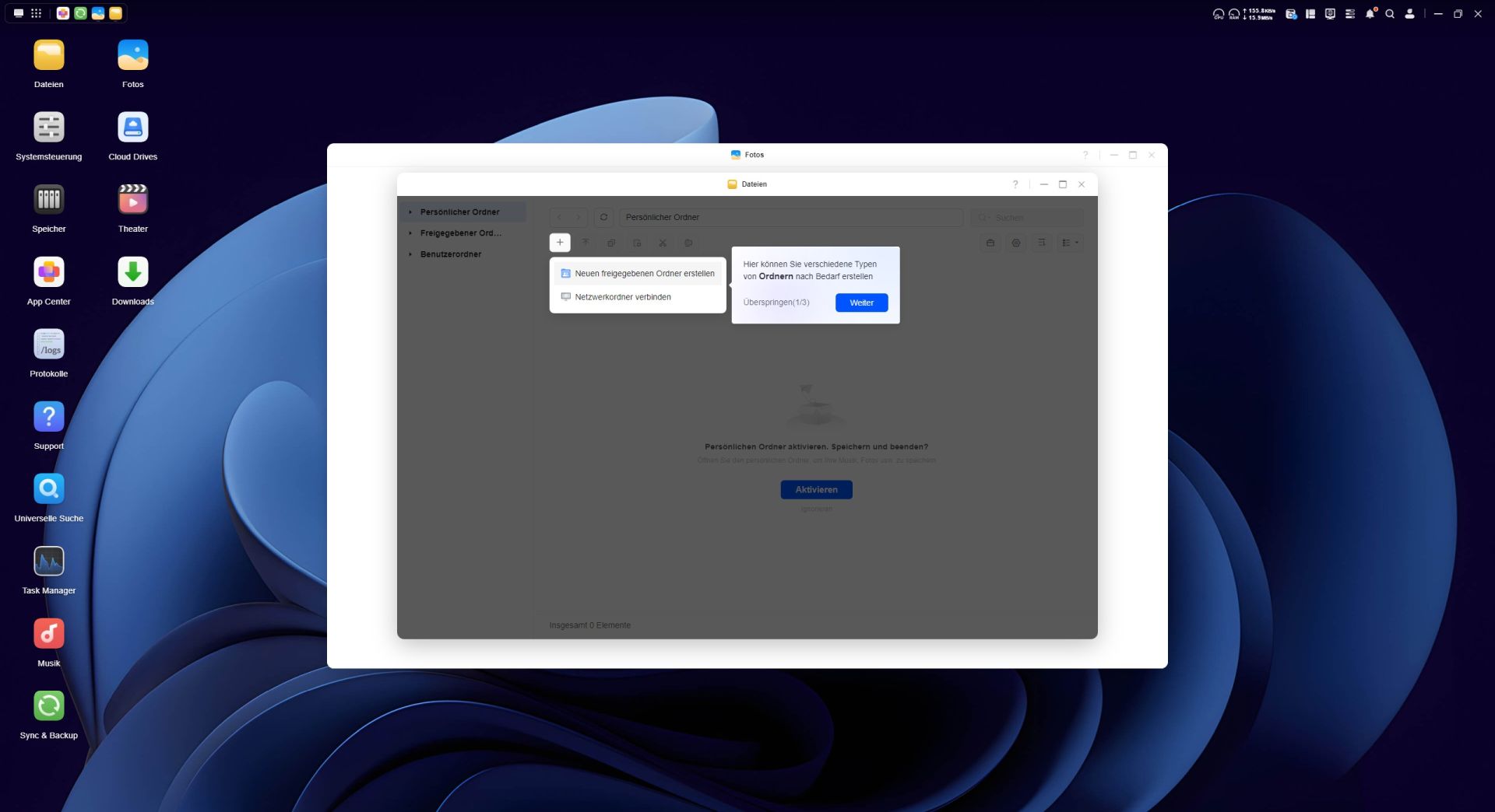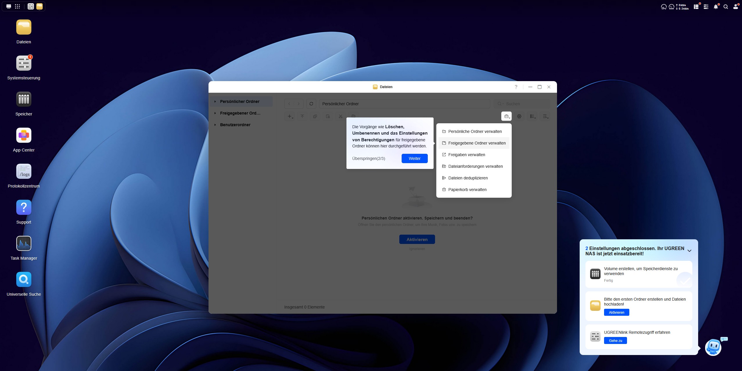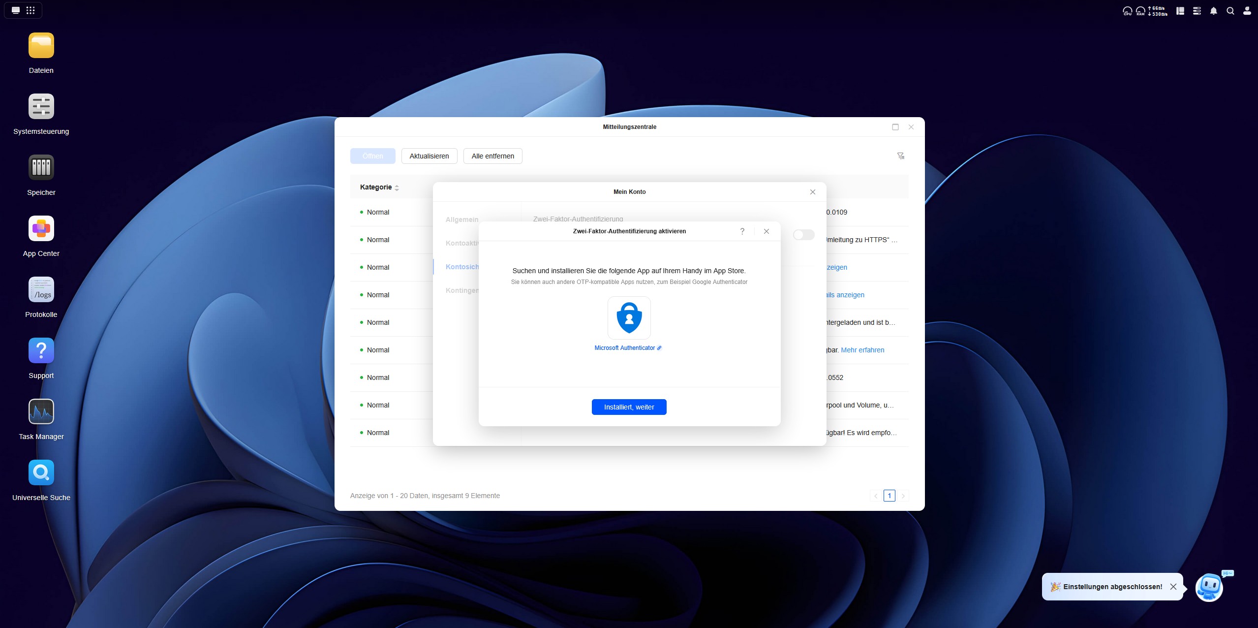 Als nächstes kümmern wir uns um die Einrichtung des ersten Ordners, in den wir Daten hochladen und synchronisieren können. Hierzu führt uns ein kleiner Chatbot in der rechten unteren Ecke durch die Einrichtung in drei Schritten. Im dritten Schritt verbinden wir unsere E-Mail mit dem UGREEN Service, um einen Remote-Zugriff auf das NAS-System zu erhalten. An dieser Stelle wird das NAS über das Internet erreichbar und wir müssen dem Service des chinesischen Herstellers UGREEN vertrauen. Als letzten Schritt der Einrichtung erstellen wir eine Zwei-Faktor-Authentifizierung über den Google Authenticator, auch wenn der Microsoft Authenticator vorgeschlagen wird. Ist die Einrichtung abgeschlossen, checken wir das System noch auf Updates, erneuern die Software und überprüfen über die Mitteilungszentrale alle erfolgten Schritte mit Zeitstempel. Nun ist das System einsatzbereit.