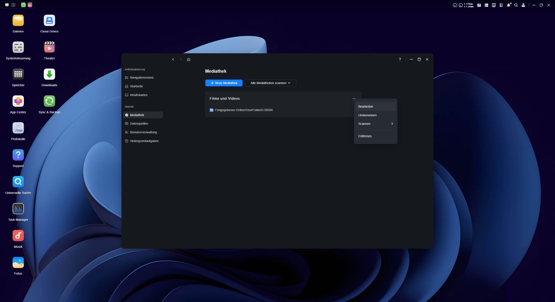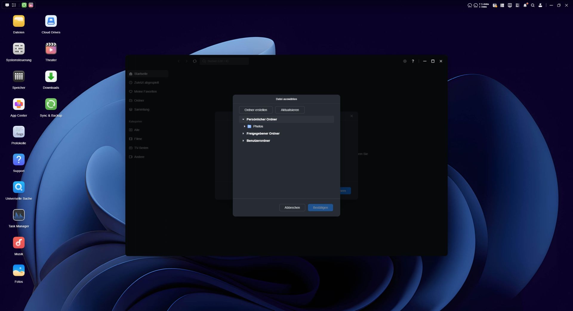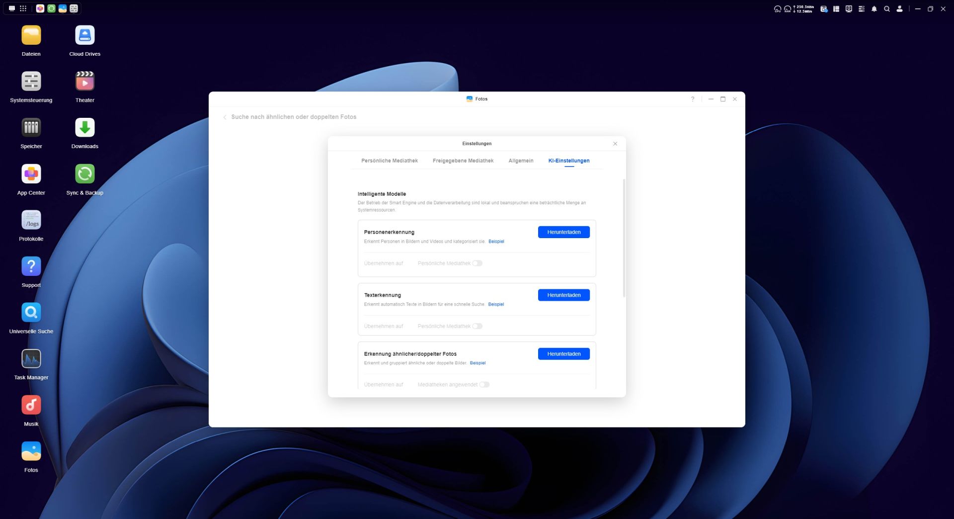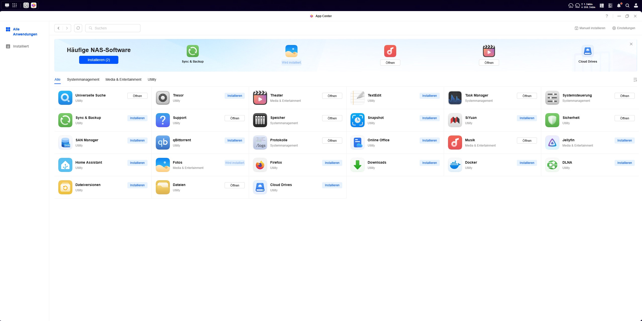 Das App Center ermöglicht eine unkomplizierte Installation zusätzlicher Anwendungen auf dem NAS. Allerdings fällt die Auswahl im Vergleich zu anderen NAS-Systemen recht überschaubar aus. Der Großteil der angebotenen Programme stammen aus dem UGREEN NASync-Ökosystem, während Apps von Drittanbietern bislang nur vereinzelt verfügbar sind. Besonders erwähnenswert ist die Integration von Docker, mit den sich Container direkt auf dem NAS betreiben lassen. Für die Verwaltung von Medieninhalten stellt UGREEN eigene Anwendungen wie „Fotos“, „Musik“ und das „Videozentrum“ bereit.