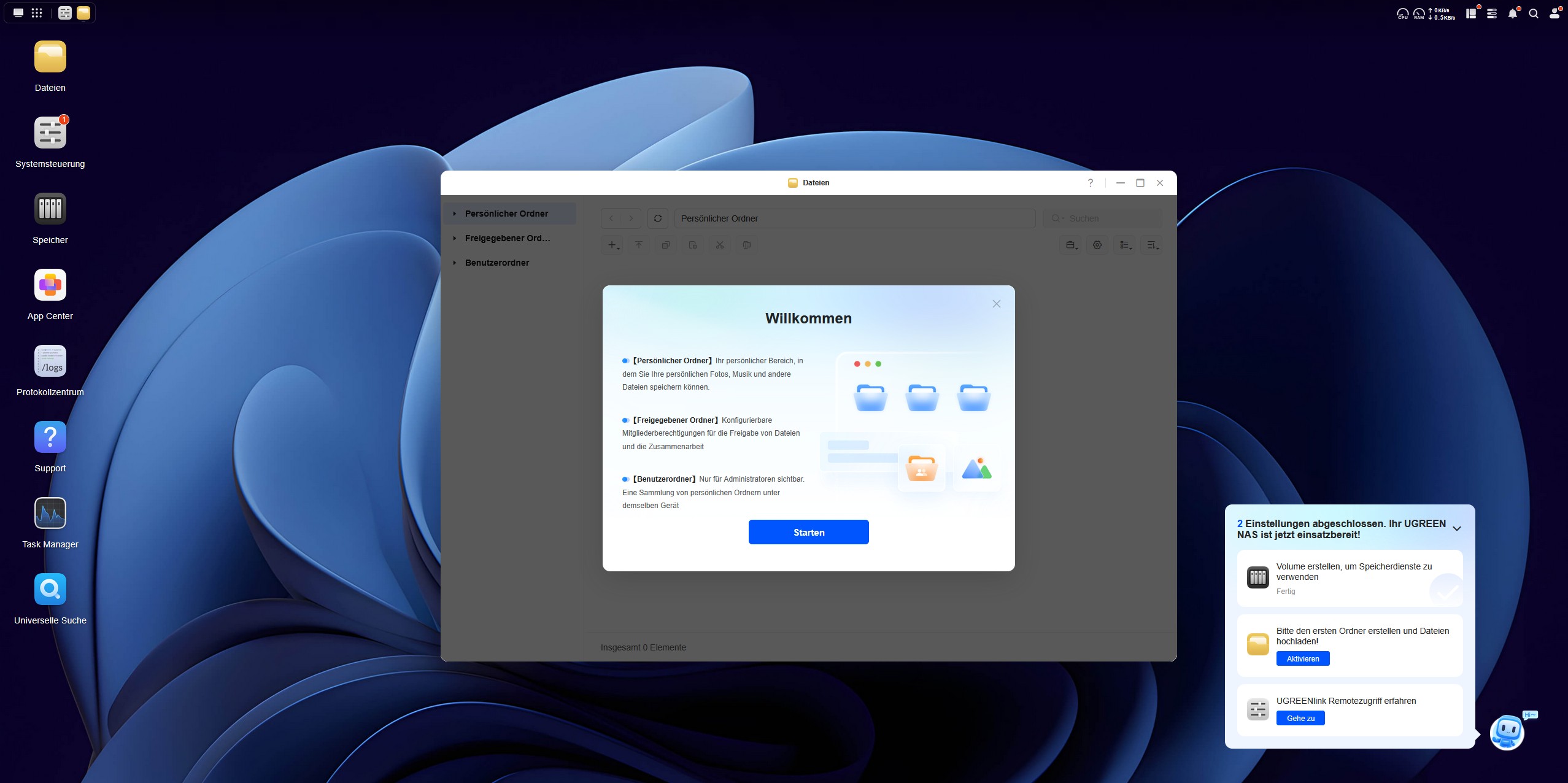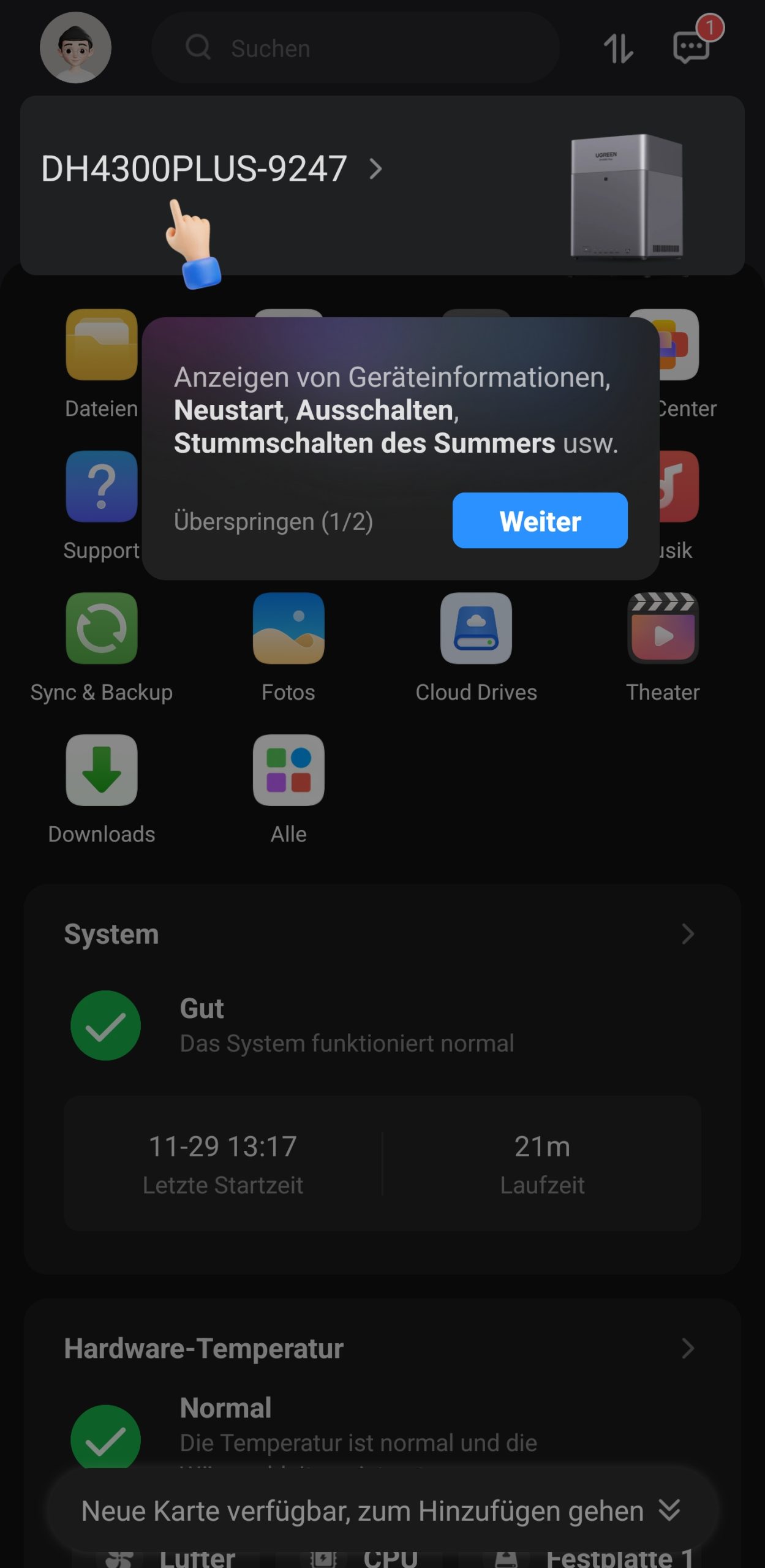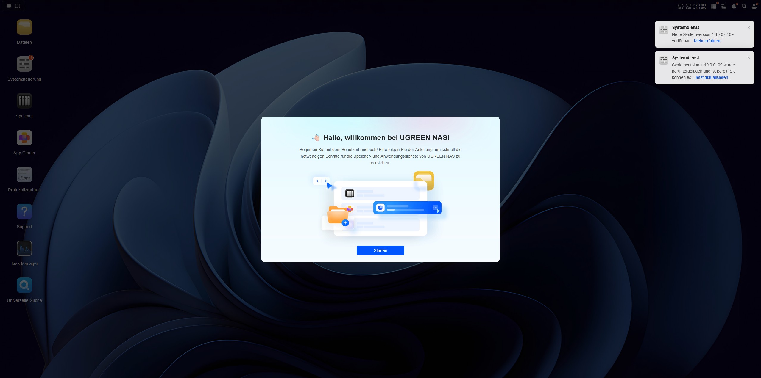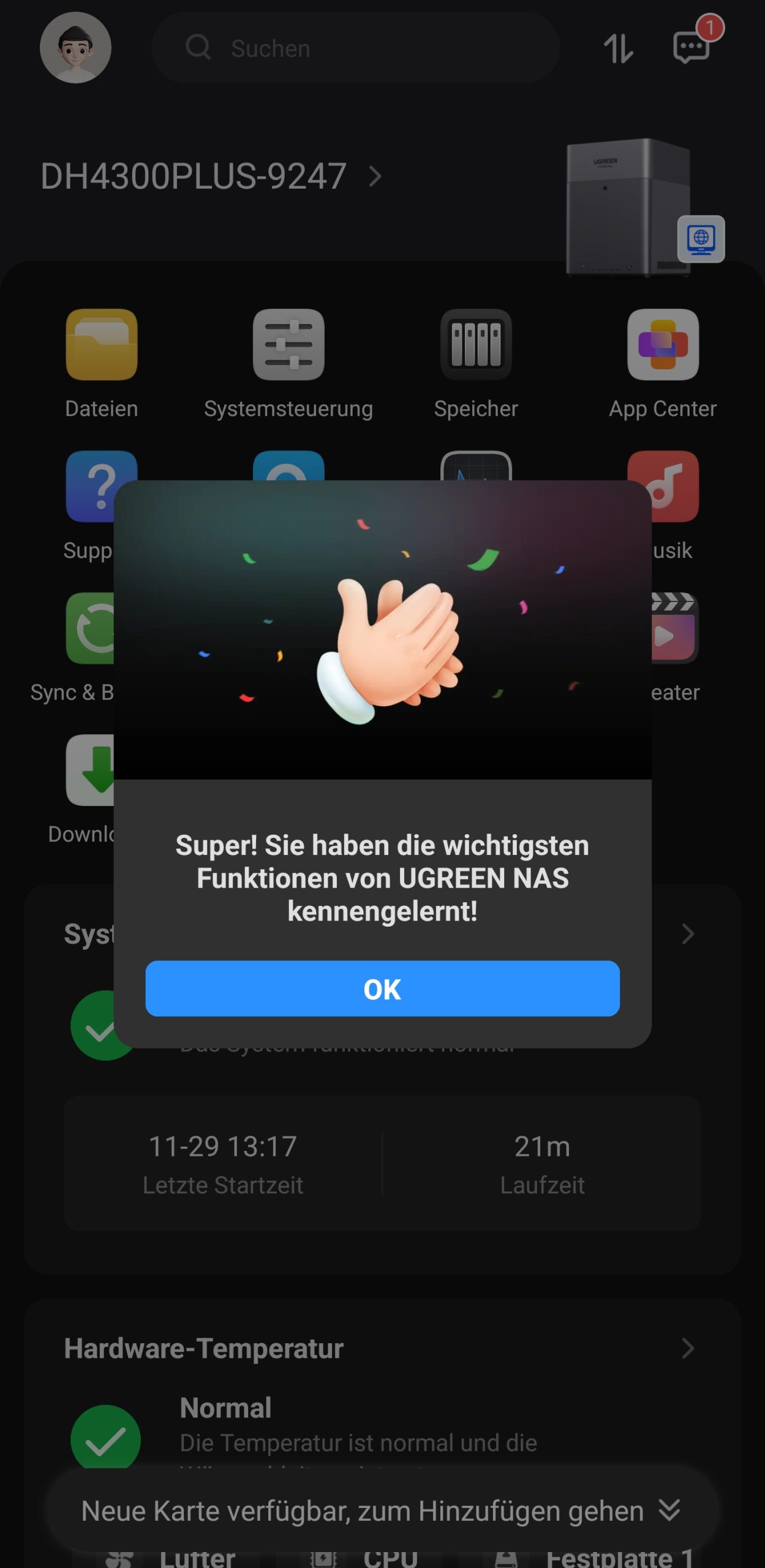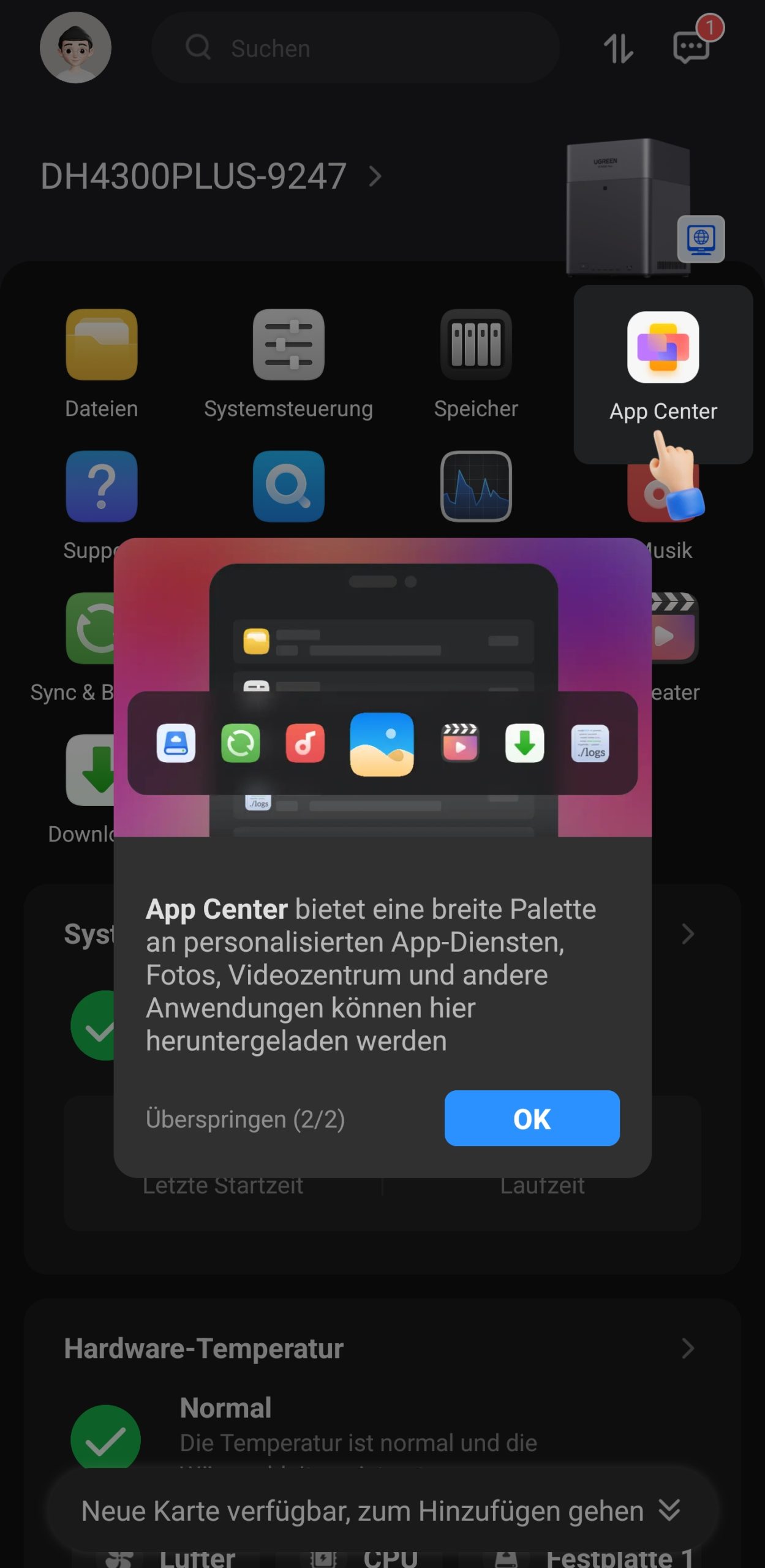 Während das System installiert wird, werden über eine Diashow zehn Tipps vorgestellt, um die Wartezeit zu überbrücken. Nach der Installation begrüßt uns der Startbildschirm mit einem Verweis auf das Benutzerhandbuch. Der Quick-Start-Guide besitzt auf der ersten Seite einen QR-Code, der uns zum UGREEN Download Center führt. Hier finden wir eine ausführliche Anleitung.