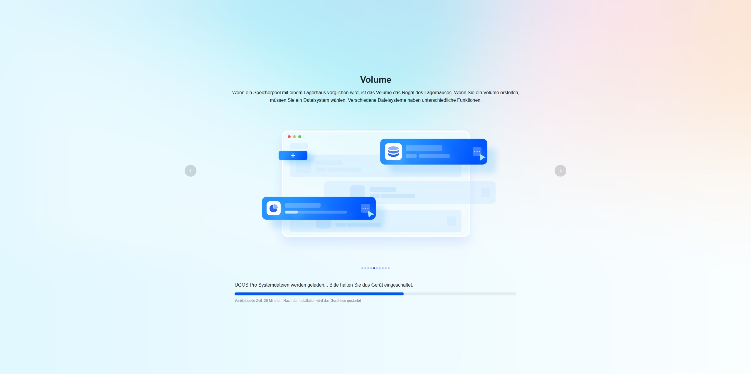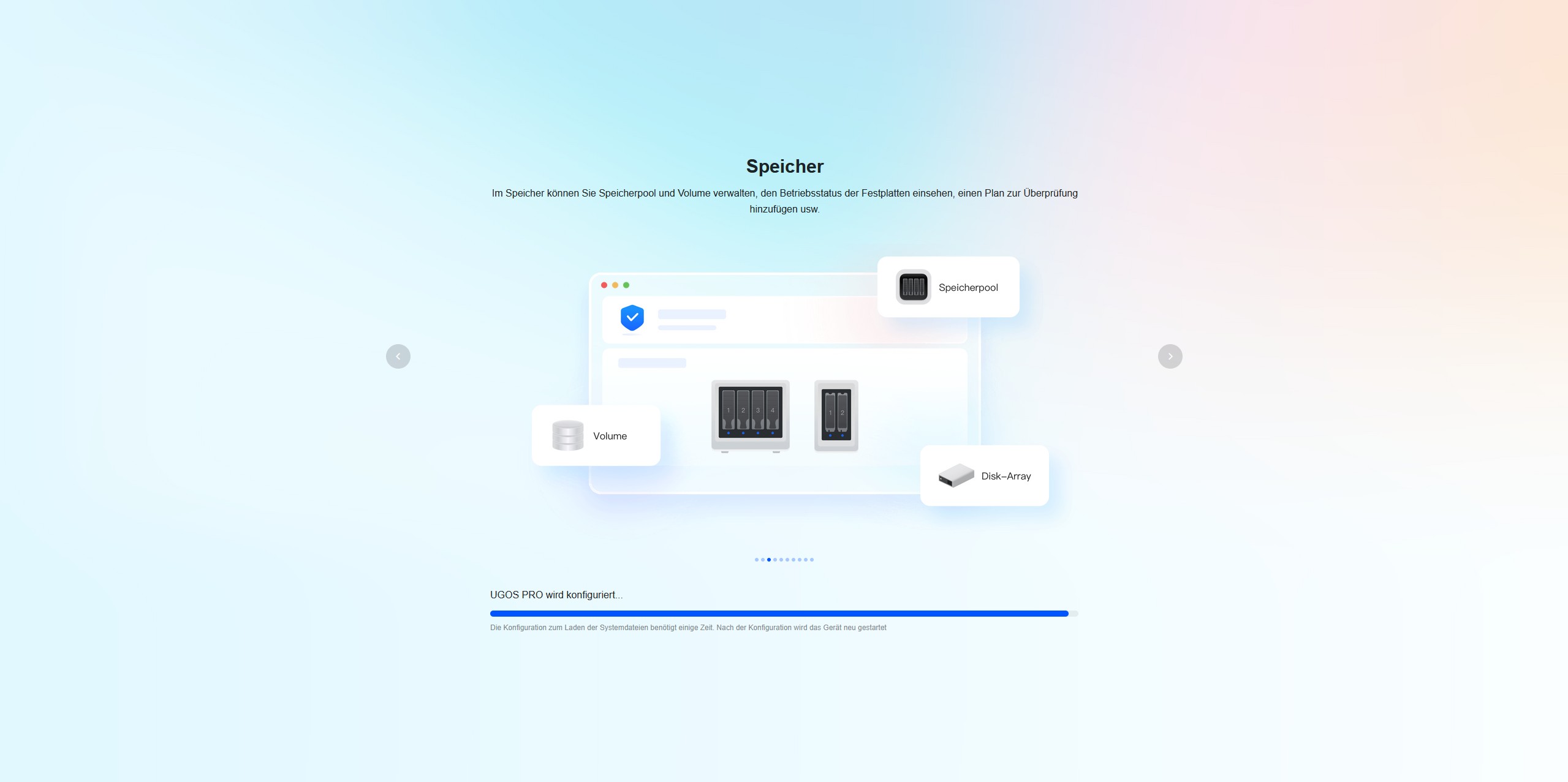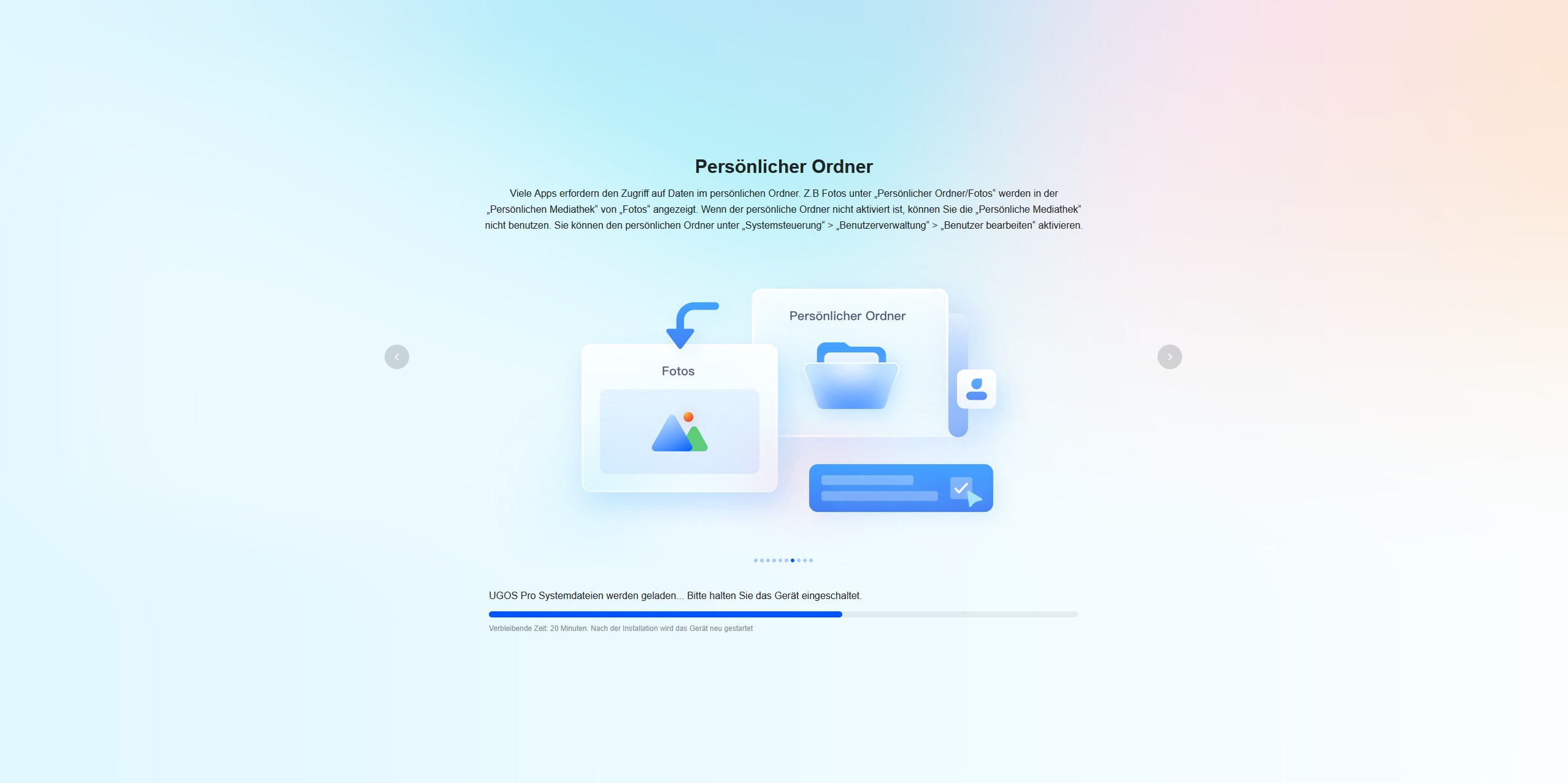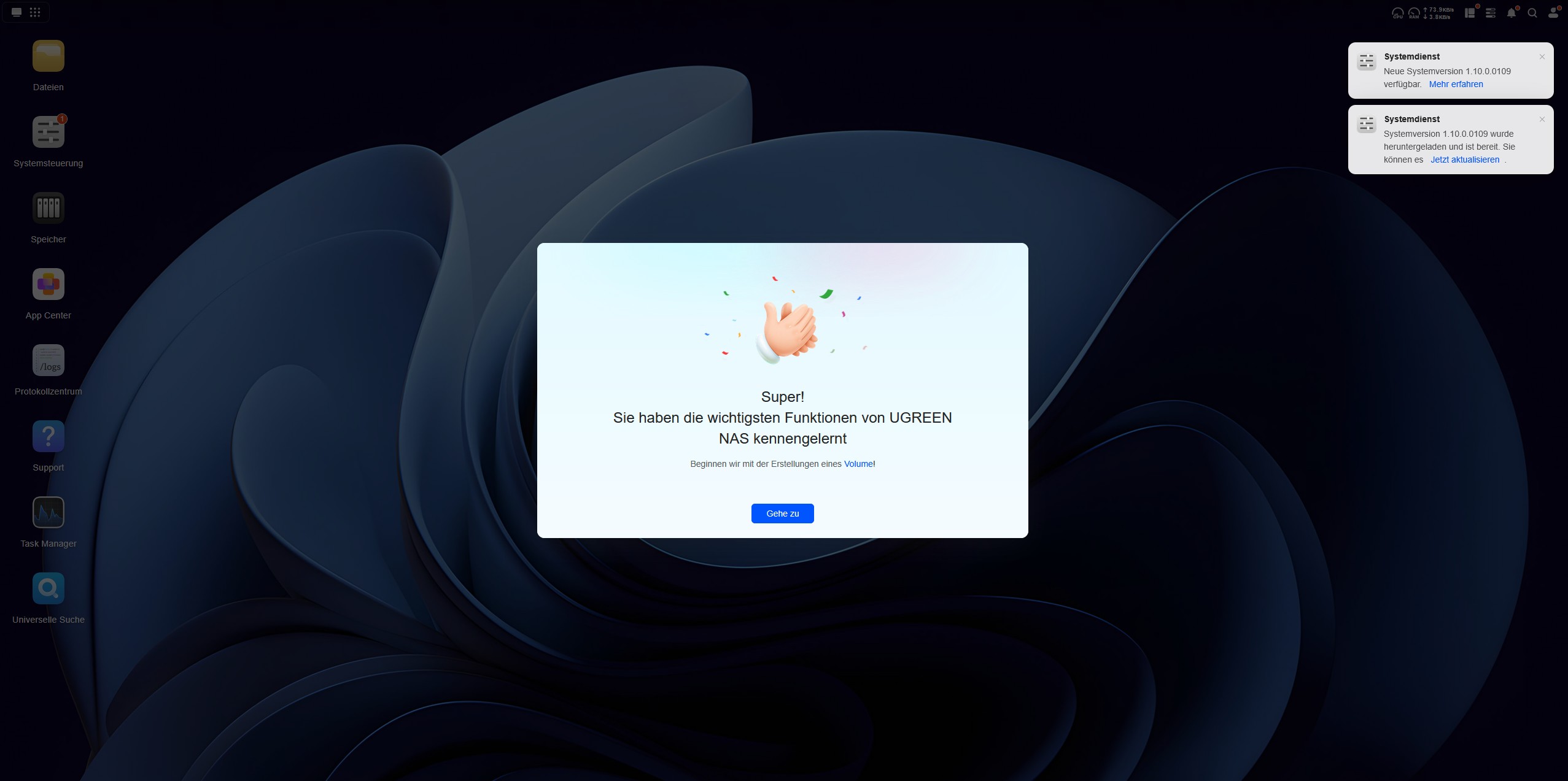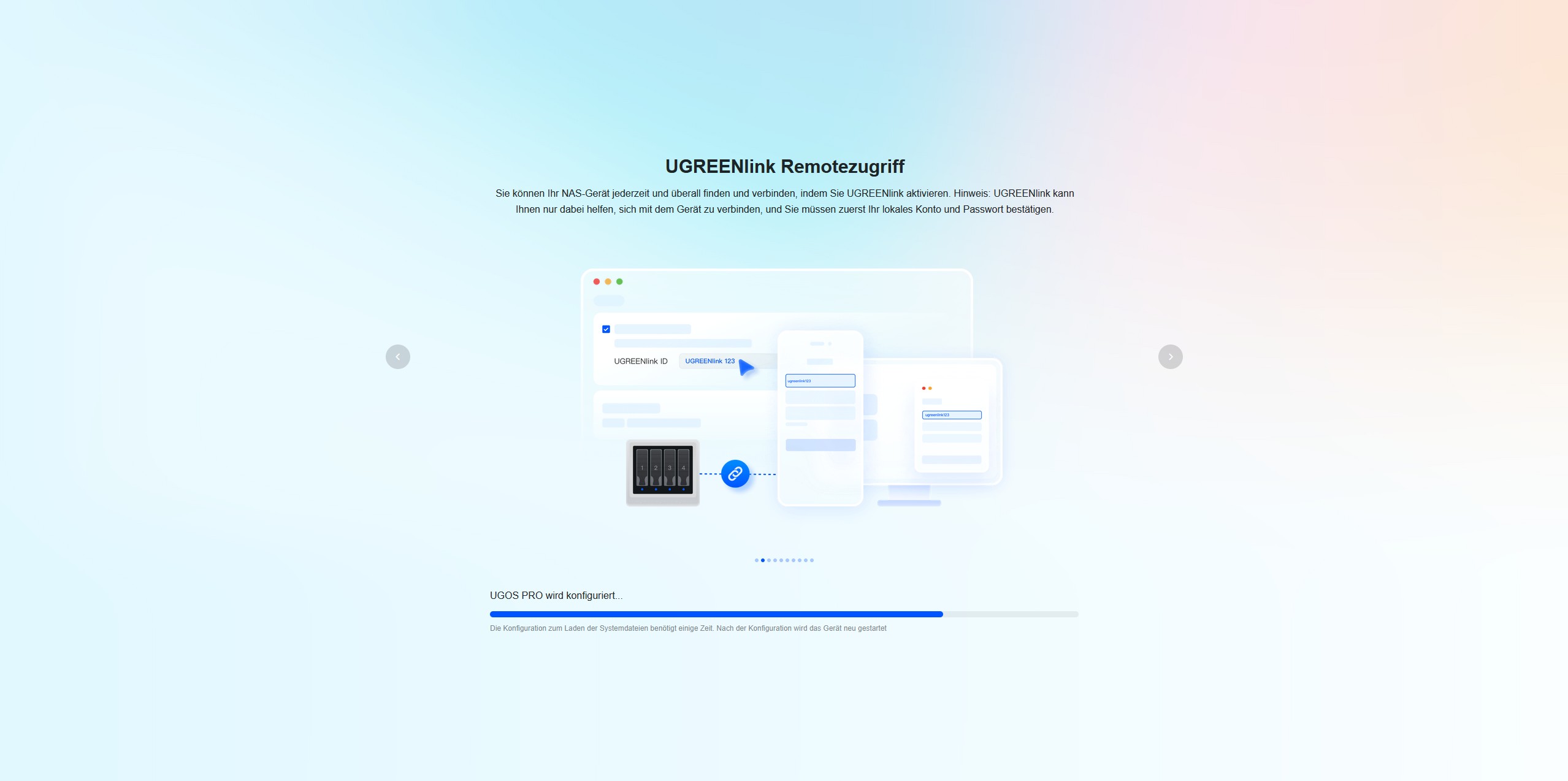 Während das System installiert wird, werden über eine Diashow zehn Tipps vorgestellt, um die Wartezeit zu überbrücken. Nach der Installation begrüßt uns der Startbildschirm mit einem Verweis auf das Benutzerhandbuch. Der Quick-Start-Guide besitzt auf der ersten Seite einen QR-Code, der uns zum UGREEN Download Center führt. Hier finden wir eine ausführliche Anleitung.