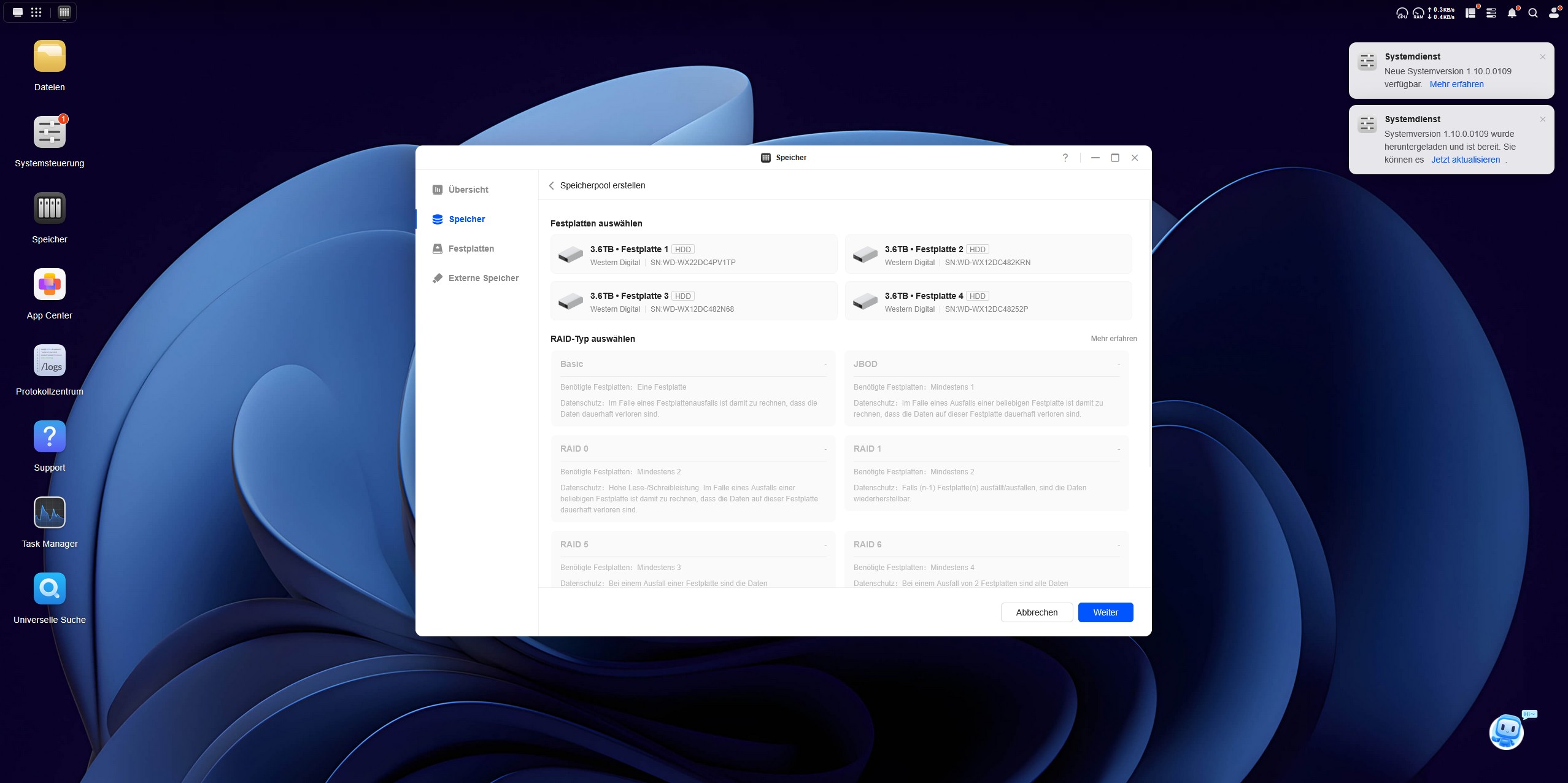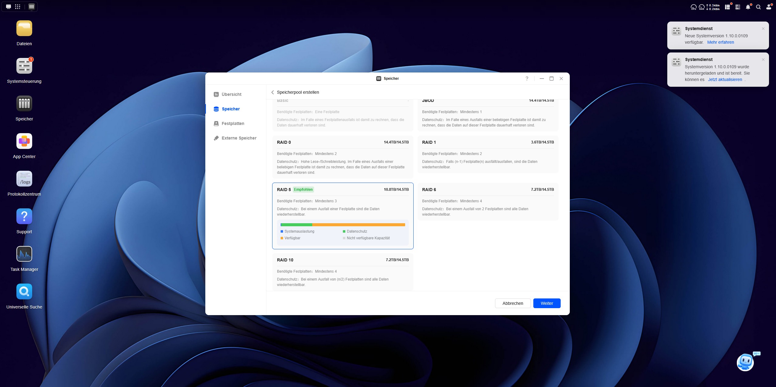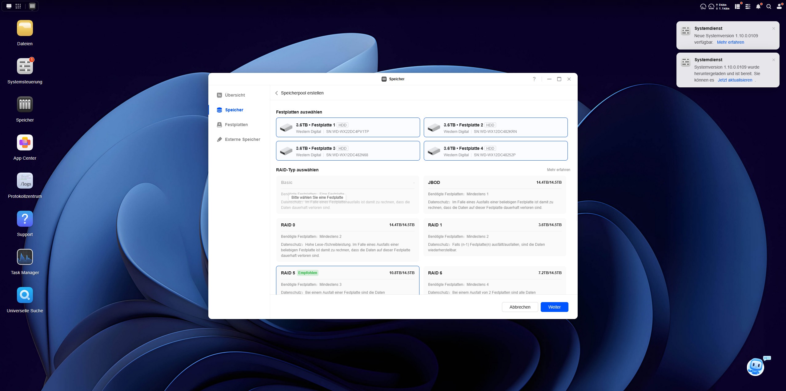 | Speichermodus | JBOD / Basic / RAID 0 / RAID 1 / RAID 5 / RAID 6 / RAID 10 |
