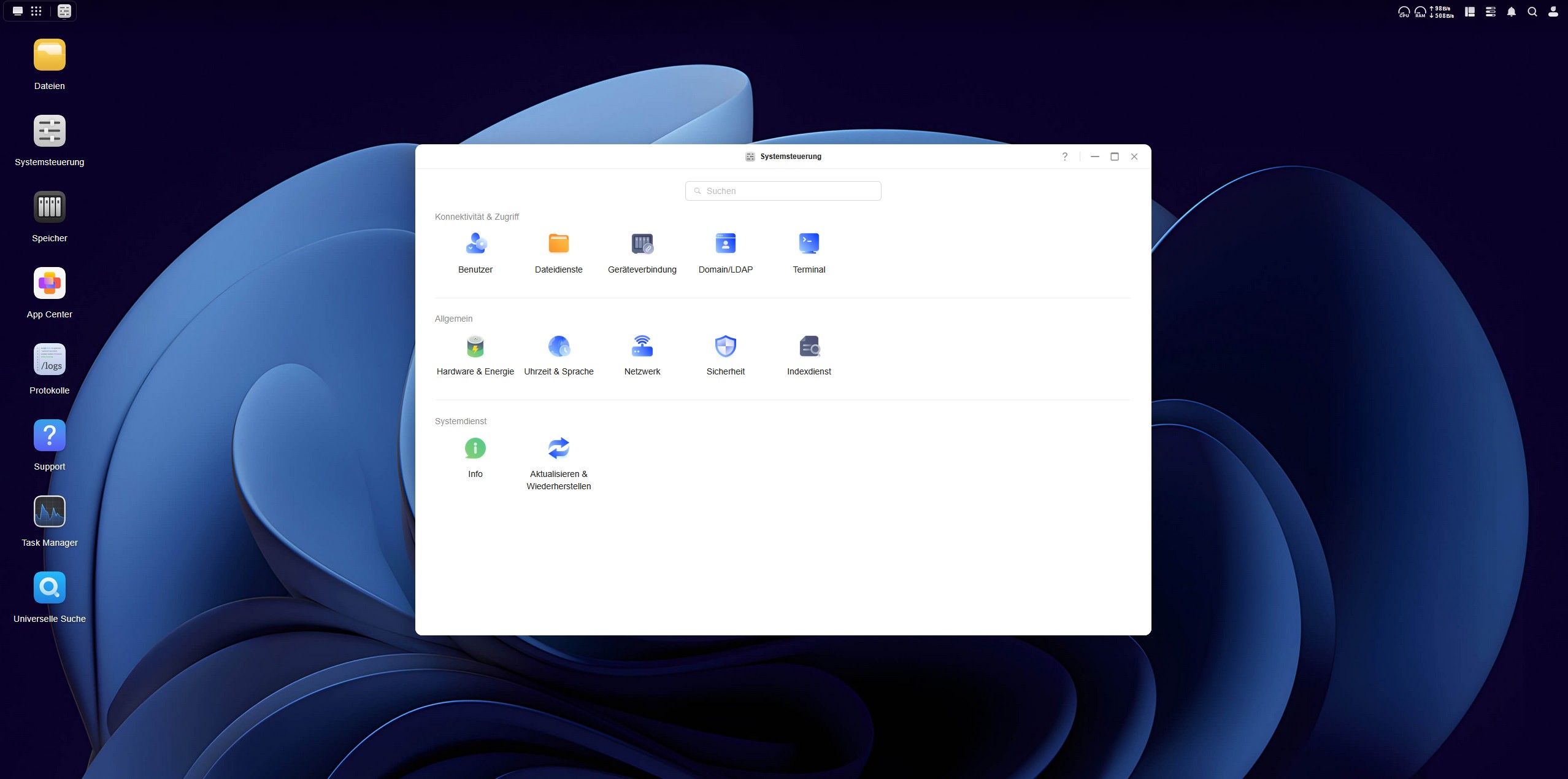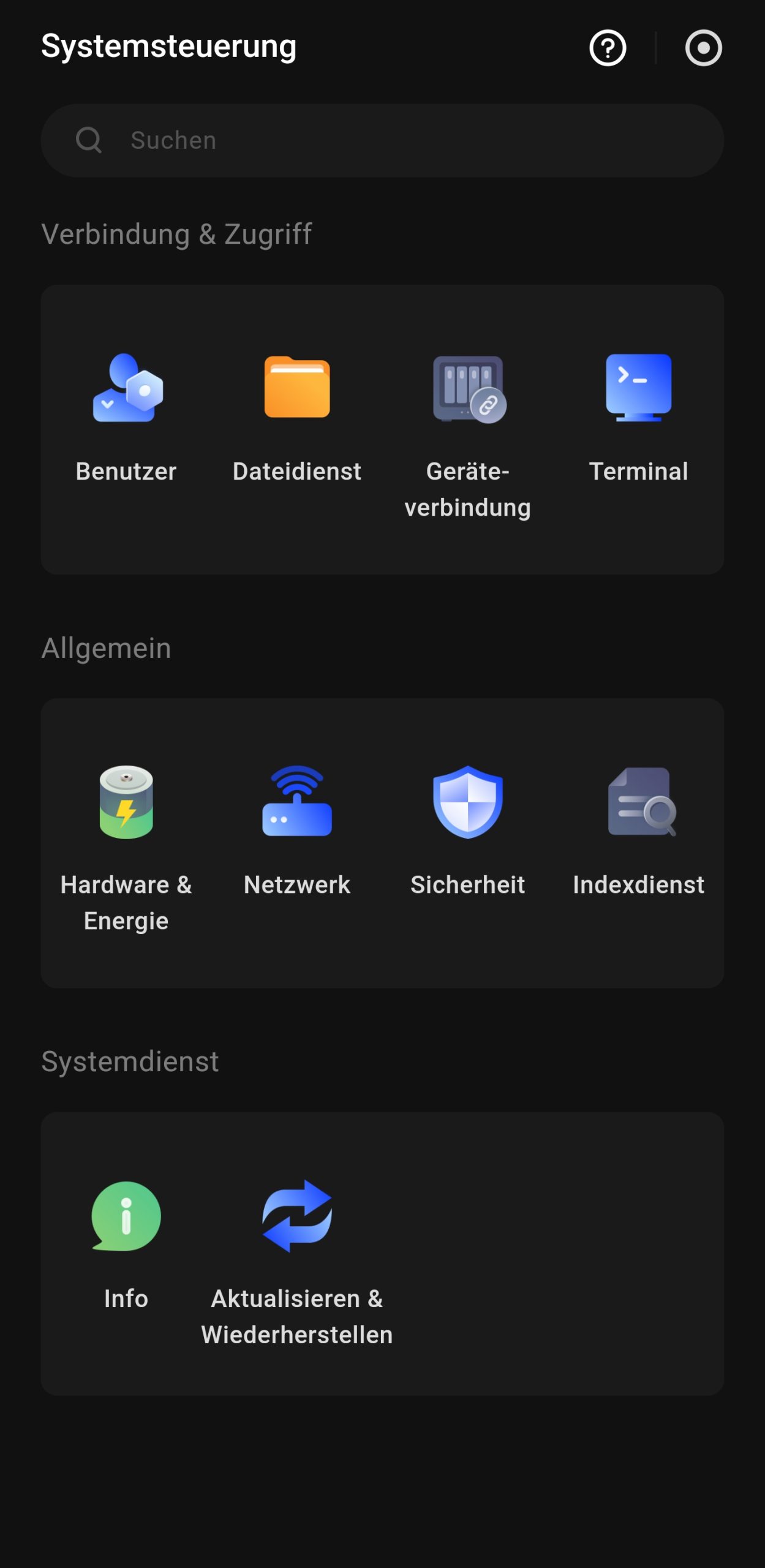 In der Systemsteuerung sind die verfügbaren Optionen in drei Bereiche gegliedert. Im Abschnitt Konnektivität & Zugriff lassen sich Netzwerkdienste konfigurieren, um den Zugriff auf das NAS von unterschiedlichen Clients zu ermöglichen. Unter Allgemein stehen Hardware-Einstellungen bereit, beispielsweise zur Stromversorgung oder Lüftersteuerung. Im Bereich Systemdienst erhält man Systeminformationen und kann zudem die Firmware aktualisieren.