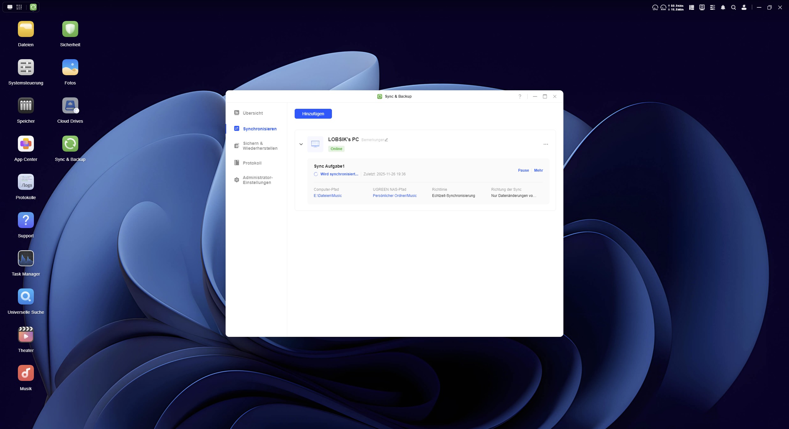 Auch eine Synchronisation zwischen zwei UGREEN Geräten ist problemlos möglich. Hierzu wählen wir bei der Registerkarte Synchronisieren nicht „Diesen Computer synchronisieren“, sondern „Ein anderes UGREEN NAS synchronisieren“, passen die Sync-Regeln an, wählen die Ordner, die synchronisiert werden sollen und schon erreichen wir ein Abbild eines UGREEN NAS DXP 4800 PLUS Ordners auf dem DH 4300 PLUS.