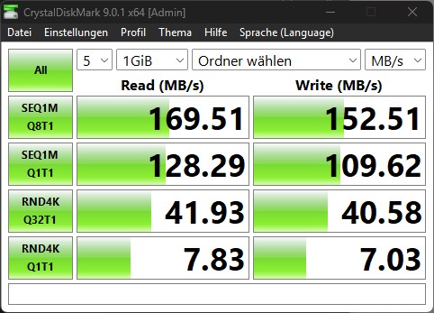Als dritten Test führen wir CrystalDiskMark über den SMB- und wsdd2-Dienst aus. Das NAS ist hierbei direkt an den PC angeschlossen, wobei das beiliegende LAN-Kabel das NAS mit unserem 5 Gbps Ethernet-Anschluss am NZXT N9 Z890 Mainboard verbindet. Wir erreichen beim Schreiben eine Geschwindigkeit von 152,51 MB/s und beim Lesen 169,51 MB/s.