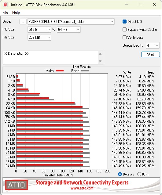 Zum Abschluss und als vierten Test bestätigt uns der Atto Disk Benchmark die Geschwindigkeiten, die wir schon mit CrystalDiskMark erreicht hatten.