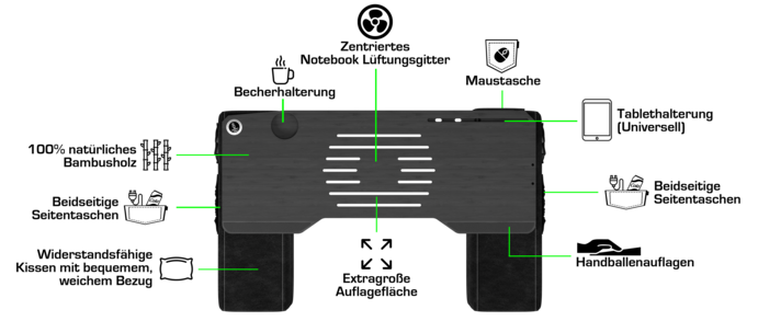 Auf der riesigen Auflagefläche aus nachhaltigem Bambusholz findet auch ein dem Paket beigefügtes Mauspad mit Klebefläche seinen Platz. Die Maustasche und die beidseitigen Seitentaschen für Netzteile, Accessoires und mehr sorgen für Ordnung. Der universelle Tablethalter (inklusive Adapter für alle Größen) trägt darüber hinaus zum komfortablen Arbeiten und Spielen bei. So hat man beispielsweise separate Spieldaten oder Notizen für berufliche Präsentationen immer im Blick.