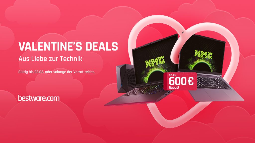 bestware.com startet mit den Valentine’s Deals die erste große Rabattkampagne des Jahres, die angesichts der fortlaufenden Preissteigerungen für RAM und SSDs umso attraktiver ist. Gaming-Laptops und Ultrabooks von XMG gibt es im Rahmen der Verkaufsaktion mit bis zu 600 Euro Rabatt auf Festkonfiguration und mit bis zu 15 Prozent auf frei konfigurierbare Notebooks.
