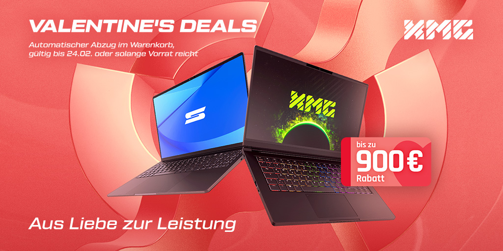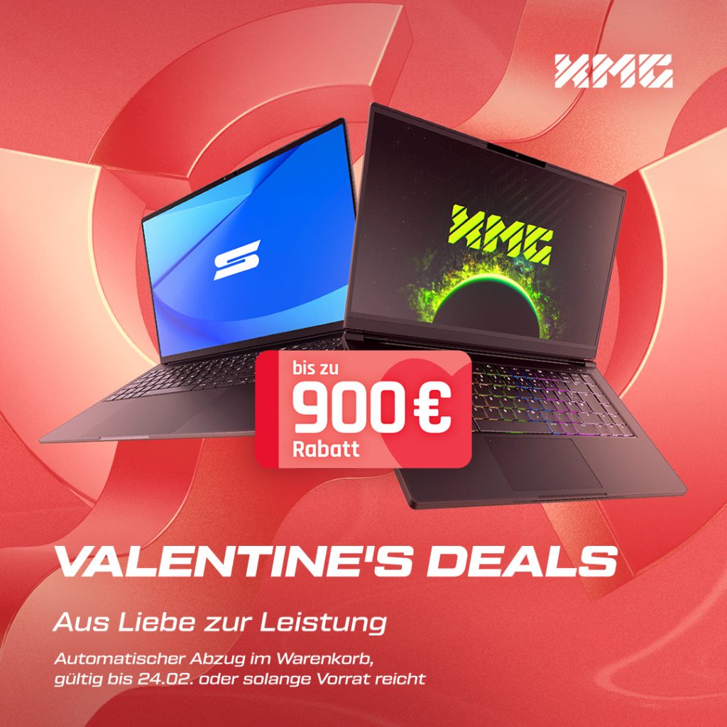 Ab Dienstag, dem 14. Februar um 15 Uhr gilt bei bestware.com: „VALENTINE’S DEALS – Aus Liebe zur Leistung.“ Die große Rabattaktion des Online-Shops zum Valentinstag umfasst sowohl Gaming-Laptops von XMG als auch schlanke Ultrabooks mit viel Leistung von SCHENKER. Die Aktion läuft insgesamt 11 Tage und somit bis zum 24. Februar um 23:59 Uhr. Sämtliche Rabatte werden wie üblich automatisch beim Check-out im Warenkorb abgezogen, die Preisnachlässe gelten bis zum Ende der Aktionslaufzeit oder solange der Vorrat reicht.