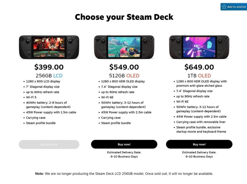 Das LCD-Modell war mit 399 US-Dollar das günstigste Steam Deck, während der Einstieg in die OLED-Reihe bei 549 US-Dollar liegt und dafür unter anderem ein HDR-OLED-Display mit 90 Hz, längere Akkulaufzeit und mehr Speicher bietet. Auf Valves Website ist die LCD-Version bereits ausverkauft; Restbestände sind nur noch bei Drittanbietern erhältlich.