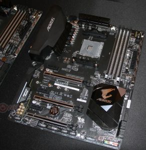 Zuletzt wurde noch das High-End Board „Aorus AX370 Gaming 5“ gezeigt. Bei diesem Board bekommt man alle RGB LED Beleuchtungsmöglichkeiten, die man von einem Aorus erwarten kann. Die Boardausstattung ist mit einem 10-Phasen VRM Design noch ein bisschen stärker als bei den „kleineren“ Brüdern. Außerdem ist dem Board noch ein zusätzlicher 32 Gbps U.2 Port hinzugefügt worden.