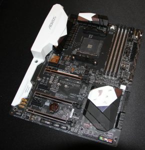Noch ein Stufe höher angesiedelt ist das AX370 Gaming K5 mit Aorus Branding. Basierend auf dem „top-tier“ X370 Chipsatz bekommt dieses Board ebenfalls ein 7-Phasen VRM Design, allerdings mit höher kapazitiven Ferritkern-Chokes. Bei dem Mainboard bekommt man zwei PCI-Express 3.0 x16 Slots (x8/x8 wenn beide benutzt werden). Der dritte x16 Slots ist wieder nur elektrisch mit x4 angebunden. Für Laufwerke finden sich ein 32 Gbps M.2 Slot, zwei 16 Gbps SATA-Express und acht SATA 6 Gbps Ports. Vier USB 3.1, sechs USB 3.0, ein 8-Kanal AMPUp! onboard Audio Chip und Intel gigabit Ethernet runden das Gesamtpaket ab. Auf dem Chipsatz-Kühler findet sich auch noch das obligatorische RGB-LED Beleuchtungselement.