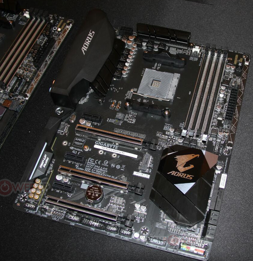 Noch ein Stufe höher angesiedelt ist das AX370 Gaming K5 mit Aorus Branding. Basierend auf dem „top-tier“ X370 Chipsatz bekommt dieses Board ebenfalls ein 7-Phasen VRM Design, allerdings mit höher kapazitiven Ferritkern-Chokes. Bei dem Mainboard bekommt man zwei PCI-Express 3.0 x16 Slots (x8/x8 wenn beide benutzt werden). Der dritte x16 Slots ist wieder nur elektrisch mit x4 angebunden. Für Laufwerke finden sich ein 32 Gbps M.2 Slot, zwei 16 Gbps SATA-Express und acht SATA 6 Gbps Ports. Vier USB 3.1, sechs USB 3.0, ein 8-Kanal AMPUp! onboard Audio Chip und Intel gigabit Ethernet runden das Gesamtpaket ab. Auf dem Chipsatz-Kühler findet sich auch noch das obligatorische RGB-LED Beleuchtungselement.