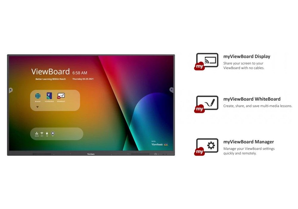Über den SmartPort USB und die Multi-I/O-Ports, einschließlich HDMI/VGA, erhalten Anwender zusätzliche Anschlussmöglichkeiten, wenn sie andere Geräte zur weiteren Unterstützung im Klassenzimmer oder Hörsaal anschließen möchten. Die mitgelieferte myViewBoard-Software (Basic Annotation, Pro Annotation, ViewSonic Launcher) für digitale Whiteboards kombiniert ein Höchstmaß an Sicherheit mit Cloud-basierter Daten-Portabilität und weitere praktische Anwendungen. Dazu kommen einfach zu nutzende, kabellose Casting-Funktionen (vCast Receiver) mit sicherer Einzelanmeldung, innovative Tools für die Zusammen- bzw. Gruppenarbeit sowie die einfache Konvertierung gängiger Datei-Typen und vielem mehr. Zusätzlich bietet der myViewBoard Manager ein Single-Point Management-System, das mehrere Displays gleichzeitig steuern kann.