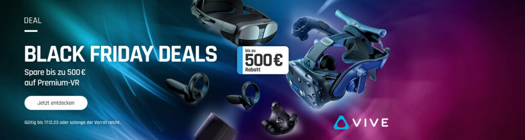 Leipzig, 01. November 2023 – Mit den VIVE Black Friday Deals läutet bestware.com eine Reihe von Aktionen rund um den wichtigsten Rabattzeitraum des Jahres ein. Dabei gibt es nicht nur für mehr als sechs Wochen zwischen 300 und 500 Euro Preisnachlass auf professionelle VR-Headsets, sondern auch ausgewähltes VR-Zubehör von HTC VIVE ist günstiger.