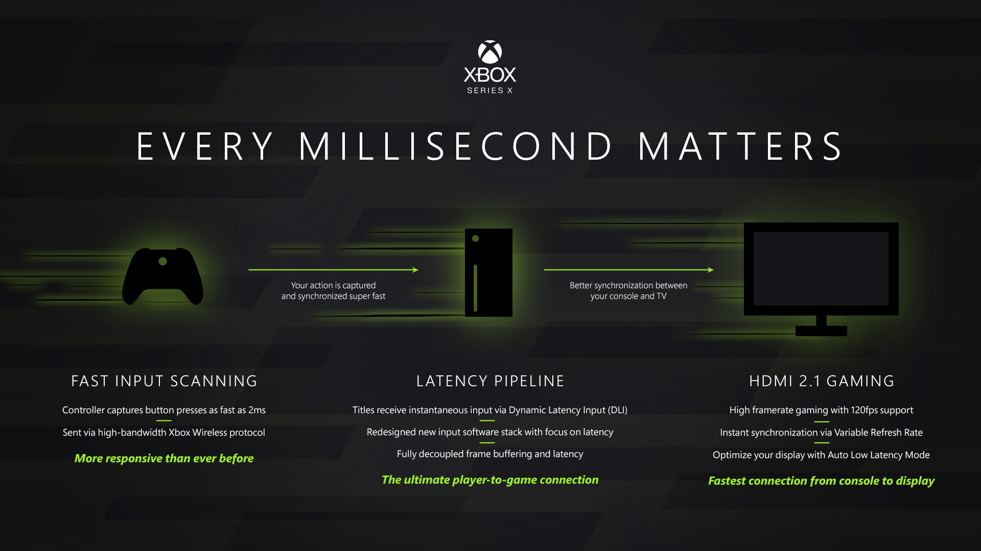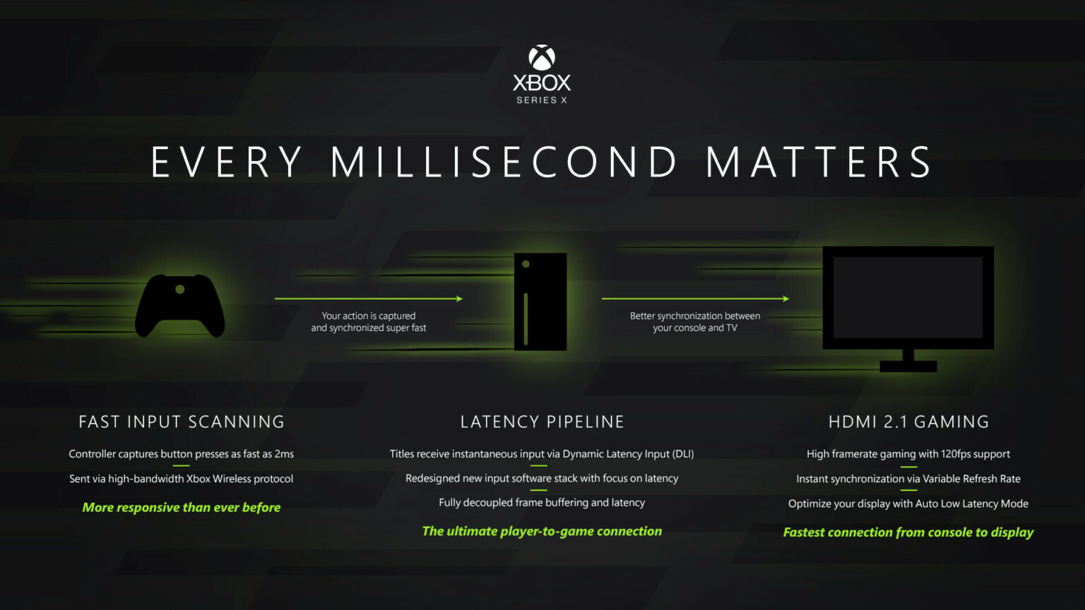 Das Speichersubsystem ähnelt dem, über das wir heute bereits berichtet haben – eine 320-Bit-GDDR6-Speicherschnittstelle mit 16 GB Speicher (gemischte Chip-Dichten). Es wird deutlich, dass Microsoft keinen hUMA Common Memory Pool-Ansatz implementiert. 10 GB von den 16 GB laufen mit 560 GB/s Bandbreite, während 6 GB davon mit 336 GB/s laufen. Ein weiterer Bereich, in dem große Hardware-Upgrades stattfinden: Die Xbox Serie X verfügt über eine 1 TB NVMe-SSD mit 2400 MB/s Spitzenwert der sequentiellen Übertragungsrate und eine Option für zusätzlichen 1 TB NVMe-Speicher über ein Erweiterungsmodul. Externe Speichergeräte werden ebenfalls unterstützt, über 10 Gbps USB 3.2 gen 2. Die Konsole ist mit einem Blu-ray-Laufwerk ausgestattet, das die 4K UHD-Blu-ray-Wiedergabe unterstützt. All diese Hardware-Spezifikationen führen zu dem, was Microsoft die „Xbox Velocity Architecture“ nennt. Microsoft arbeitet auch an der Verbesserung der Eingabe-Latenzzeit seiner Game-Controller.