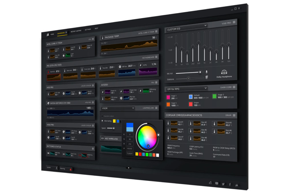 Mit iCUE bietet CORSAIR zum ersten Mal die kombinierte Überwachung von Peripheriegeräten, Hardware und ganzen Systemen auf einer zentralen Oberfläche mit Unterstützung für eine Vielzahl an CPU-Kühlern, Lüftern, PSUs und DDR4-Speichern von CORSAIR. Ein anpassbares Dashboard ermöglicht einen schnellen Überblick über Ihr gesamtes System sowie die zentrale Überwachung von Hardwaretemperaturen, Speichergeschwindigkeiten und Systemlasten. So können Nutzer die Beleuchtung und Lüftergeschwindigkeit nicht nur mit Systemtemperaturen und Lasten verknüpfen, sondern auch mit bestimmten Programmen, um die Kühlung für anspruchsvolle Spiele einzuschalten, sie beim Schauen eines Films für einen leisen Betrieb herunterzufahren oder bei hohen Temperaturen eine warme Beleuchtungsfarbe einzustellen.