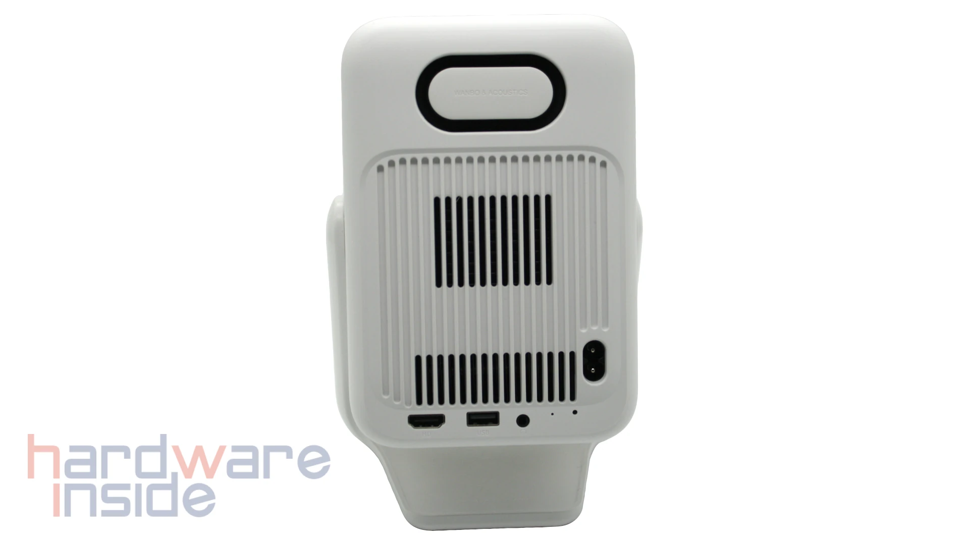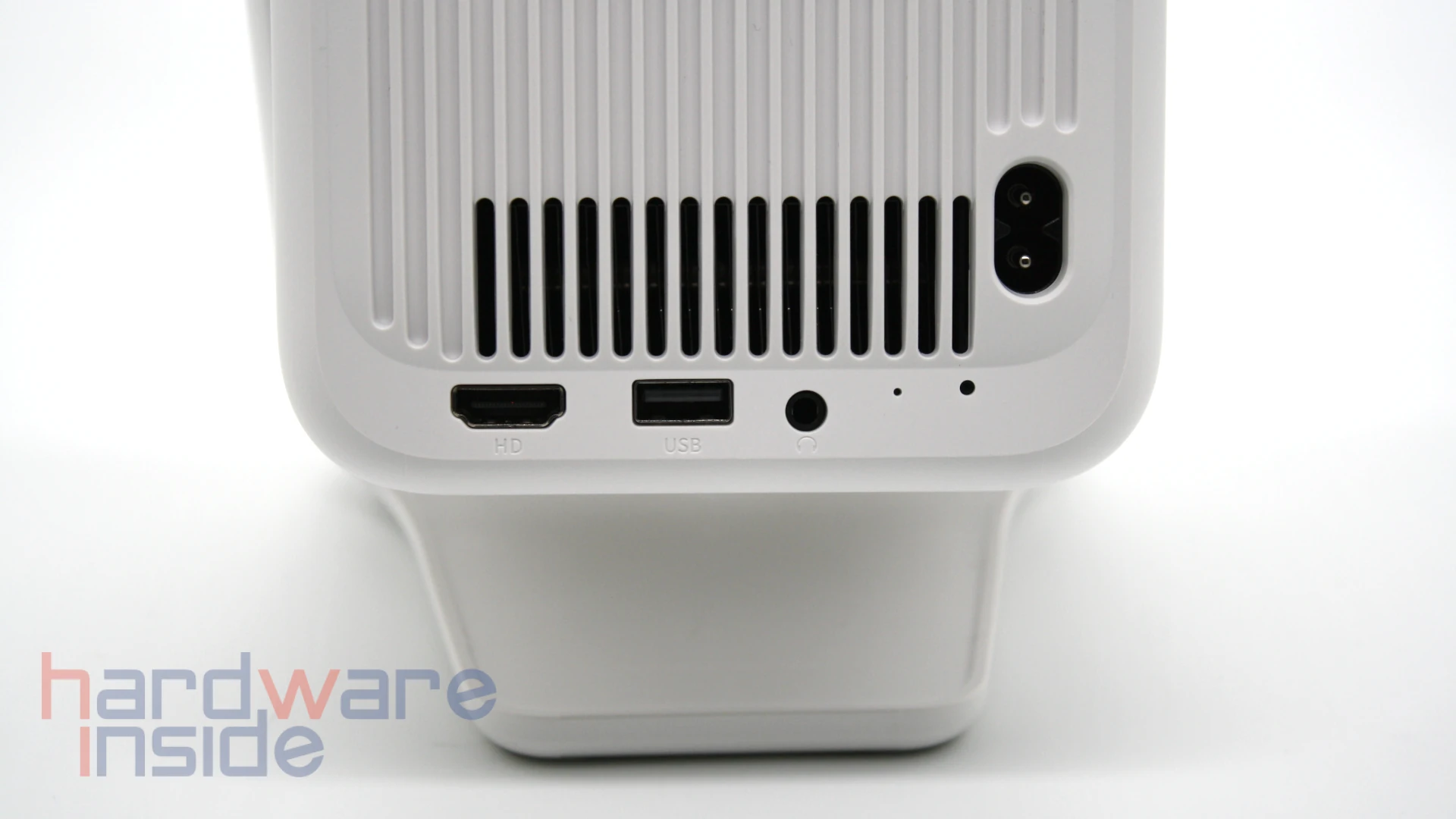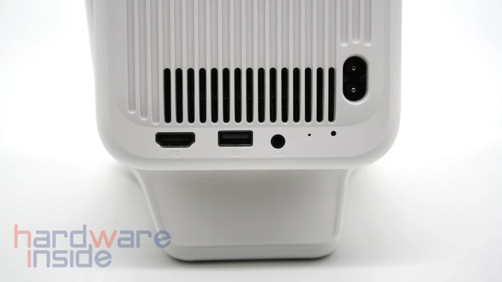 Auf der Rückseite befinden sich die Anschlüsse des Beamers, der Wanbo T2 Ultra kommt mit einem HDMI-, einem USB-Steckplatz und einem 3,5 mm Audioausgang für Kopfhörer oder Lautsprecher. Darüber hinaus ist der Wanbo T2 Ultra auch mit eigenen Lautsprechern ausgestattet, die seitlich verbaut sind. Auch ohne physisches Eingangssignal kann der Beamer per Wi-Fi verbunden werden und so auf Streamingdienste zurückgreifen, Audiogeräte können drahtlos via Bluetooth verbunden werden. In den Einstellungen des Beamers ist auch eine Option für ARC über HDMI zu finden, somit kann auch ein Audiosystem über HDMI / ARC betrieben werden – allerdings fällt dann der einzige HDMI-Anschluss für Eingabegeräte weg. Dies kann bei ausschließlicher Nutzung der Apps allerdings eine sinnvolle Option sein.