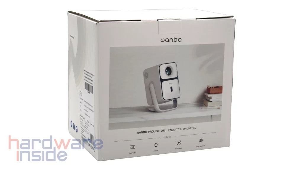 Der kompakte Wanbo T2 Ultra Beamer kommt in einem weißen Karton, im Inneren sind der Projektor und sein Zubehör von dicken Schaumstoffpolstern geschützt und fixiert.