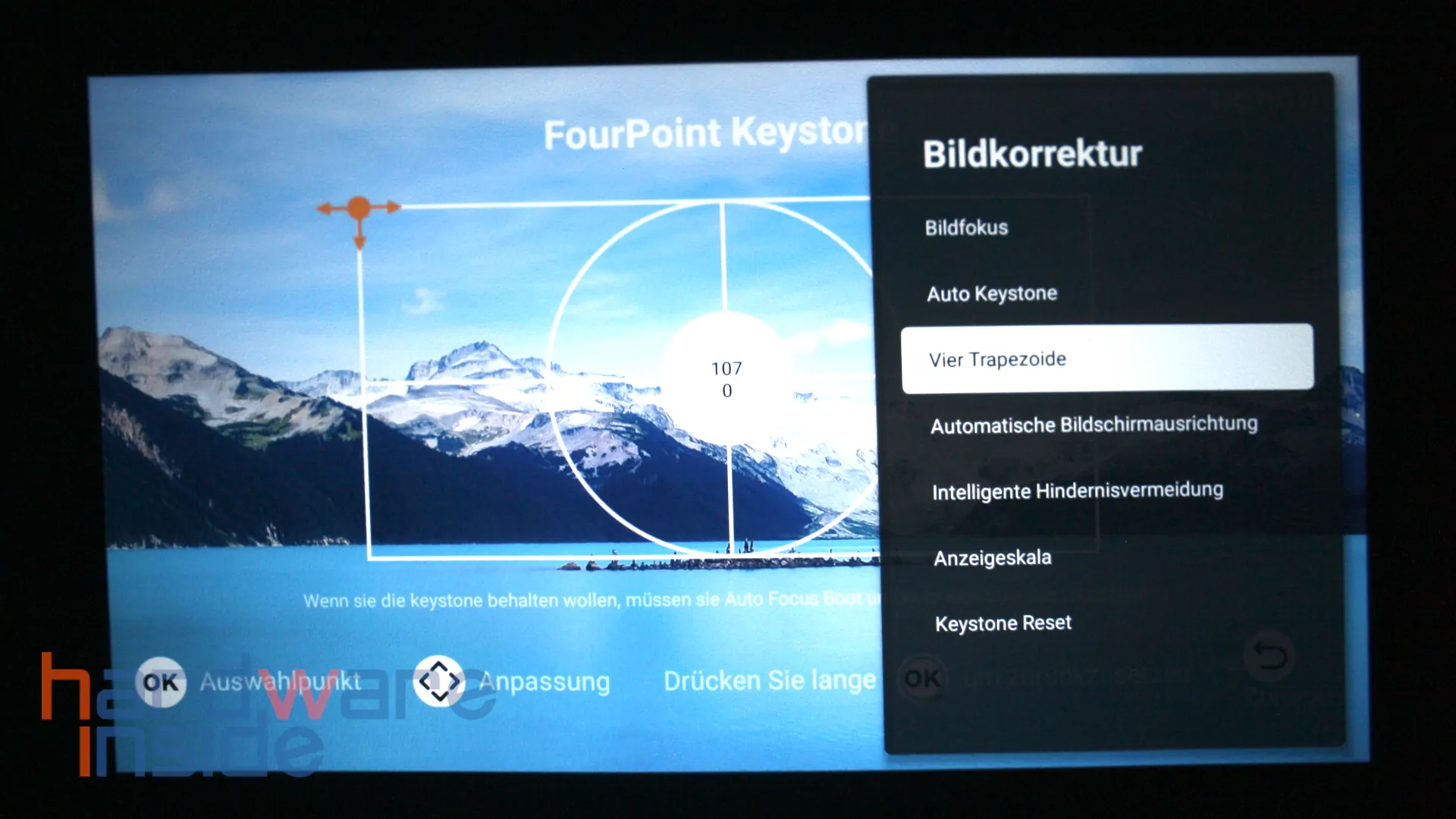 Besonders erwähnenswert sind die automatischen Funktionen zur Bildkorrektur. Der Autofokus stellt das Bild in kurzer Zeit scharf, ohne dass man selbst eingreifen muss. Auch die automatische Trapezkorrektur funktioniert erstaunlich gut, selbst bei schräger Projektion erzeugt der Beamer ein sauberes, rechteckiges Bild. Hindernisse im Projektionsfeld werden erkannt und das Bild automatisch angepasst. Das spart Zeit und Nerven, ein deutlicher Komfortgewinn im Alltag.