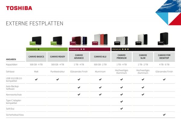 Toshiba bietet für die unterschiedlichsten Anwenderanforderungen mehrere externe Festplatten-Serien an. Weitere Informationen zu den mobilen Festplatten Canvio Advance, Canvio Alu, Canvio Premium, Canvio Slim, Canvio Basics, Canvio Ready und Canvio for Desktop finden sich unter: https://www.toshiba-storage.com/de/products/.