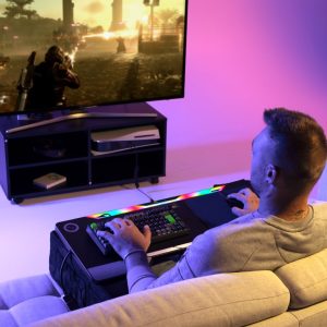 Neben verschiedenen Effekten lässt sich selbstverständlich auch eine statische Illumination auswählen. Für die Steuerung muss keine nervige Software installiert werden, alle Einstellungen lassen sich komfortabel direkt am Couchdesk einstellen. Neben der Beleuchtung kommt der Couchmaster CYCON³ mit einer schnellladefähigen USB-C-Schnittstelle und ganzen 5 USB-3.0-Ports. Darüber hinaus hat man im Hause nerdytec fleißig an Design und Materialqualität geschraubt, denn es geht immer noch ein wenig besser! Um die Ergonomie beim Zocken noch weiter zu erhöhen, stellt nerdytec darüber hinaus auch das CYBACK Keilkissen vor. Es besteht aus hochwertigem Memory-Schaum und beugt effektiv Verspannungen und Ermüdungserscheinungen vor. Dazu kommt, dass das CYBACK Kissen von der Größe perfekt zu allen Couchmaster-Modellen passt.
