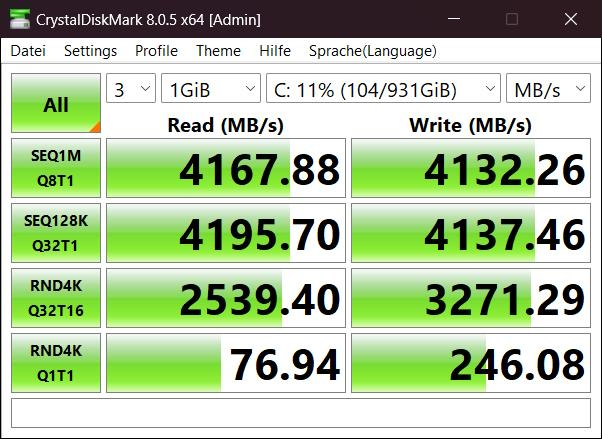 Die erste Leistungsmessung nehmen wir mit CrystalDiskMark vor. Hier erreicht die SSD bei sequenziellen Schreiben als auch Lesen nahezu die vom Hersteller angegebenen 4.150 MB/s. Natürlich gibt es auch PCIe 4.0 SSDs, welche fast doppelt so schnell sind, allerdings kosten diese entsprechend.