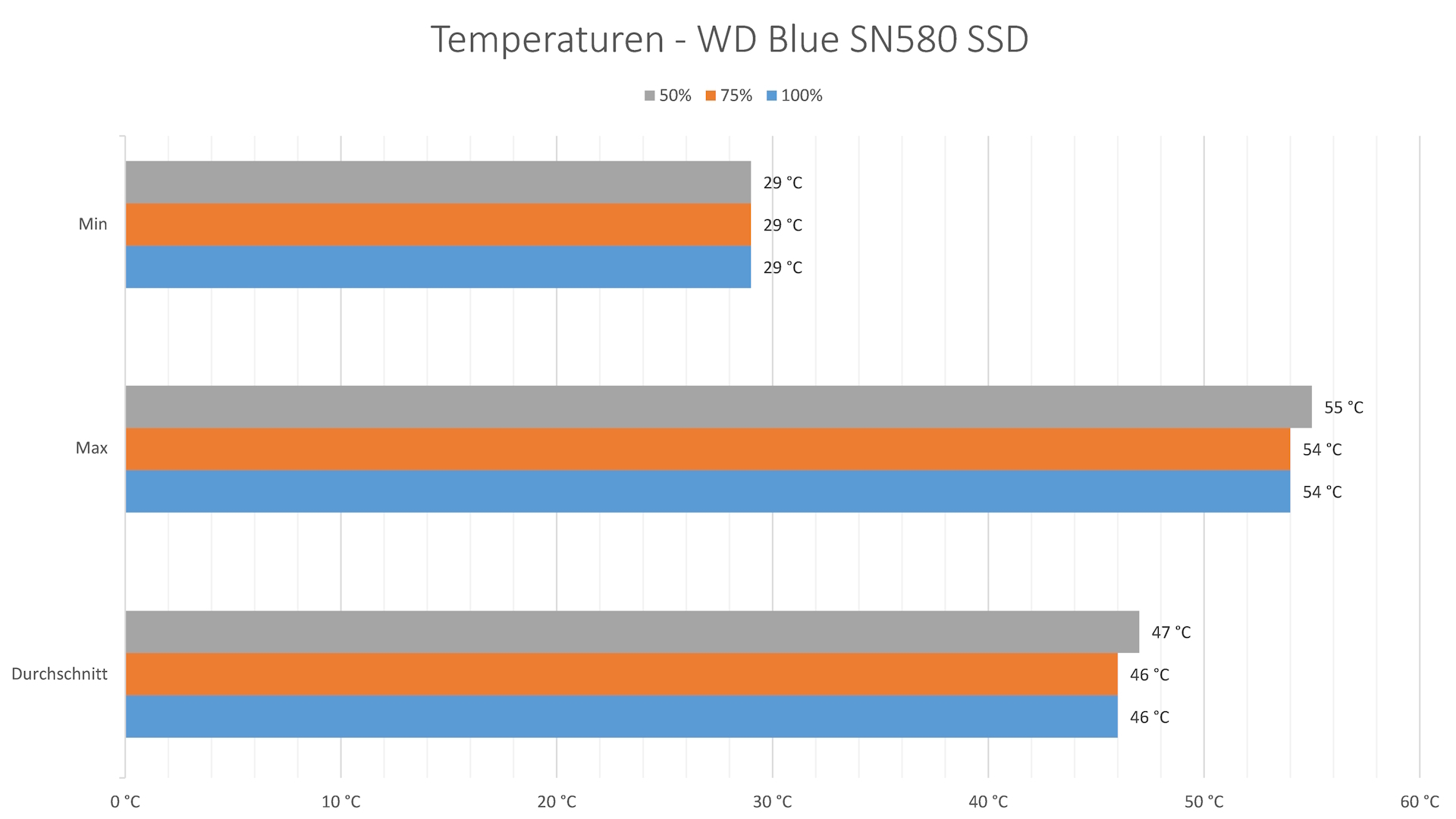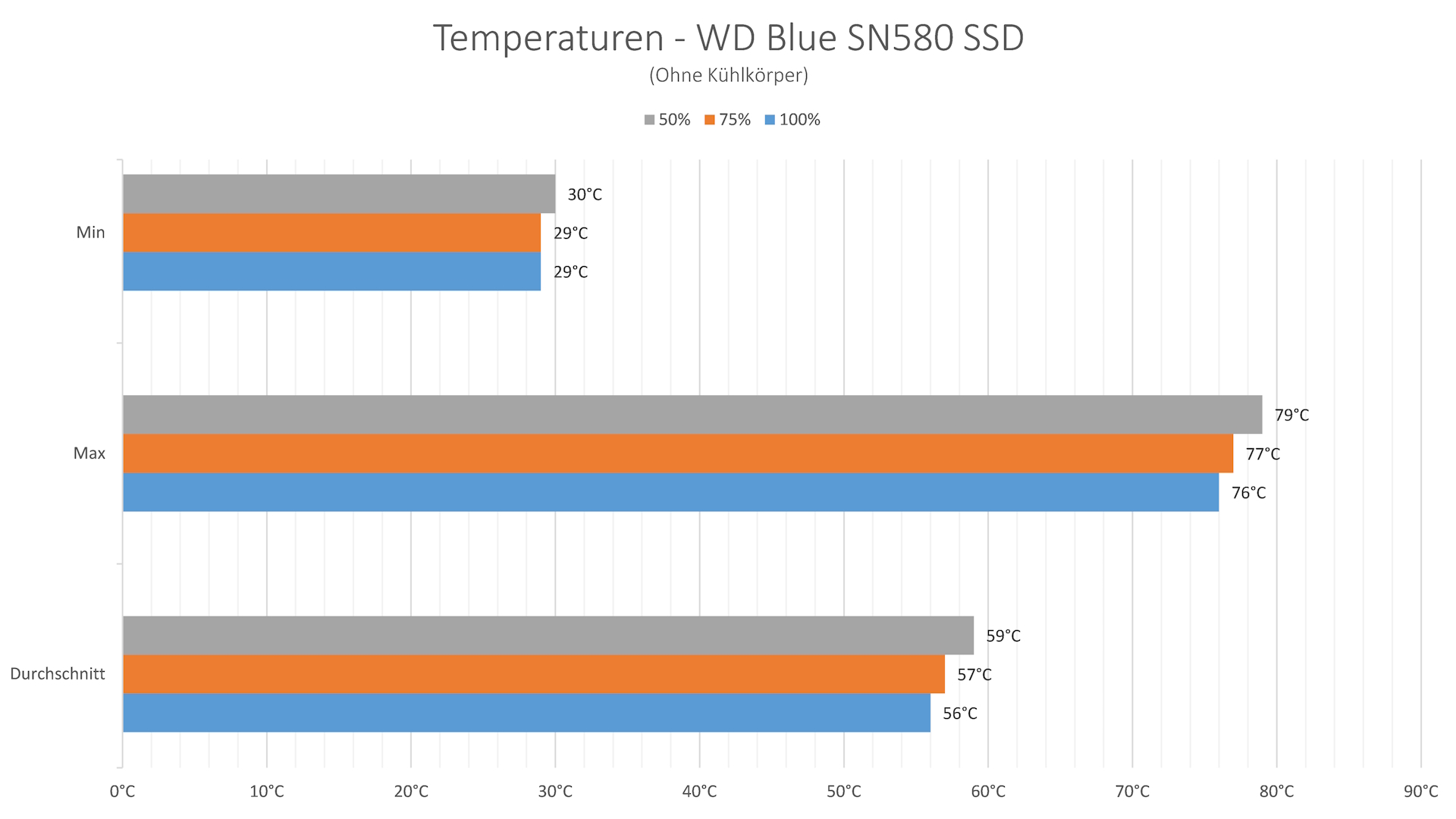 Zur Ermittlung der Temperaturen nutzen wir hier ebenfalls den CrystalDiskMark. Diesen stellen wir auf das Maximum von neun Durchläufen und lesen die Temperaturen anschließend in HWInfo ab. Um zu sehen, ob der Luftstrom der Lüfter eine positive Auswirkung auf die Temperatur haben, betreiben wir diese in drei verschiedenen Leistungsstufen. Während dieses ersten Tests nutzen wir den Kühlkörper des Mainboards an Vorder- und Rückseite der SSD. Die Raumtemperatur liegt während der Tests bei 23 °C. Während dieses Tests bleiben die Temperaturen im optimalen Bereich, sodass die Leistung nicht aufgrund der Temperaturen gedrosselt wird. Wie eingangs bereits erwähnt, testen wir einmal mit und einmal ohne den rückwärtigen Kühlkörper. Wie erwartet ändert dies nichts an den Temperaturen, da die SSD auf der Rückseite nicht bestückt ist. Die Hoffnung, dass hier trotzdem noch Wärme übertragen wird, ist damit dahin.