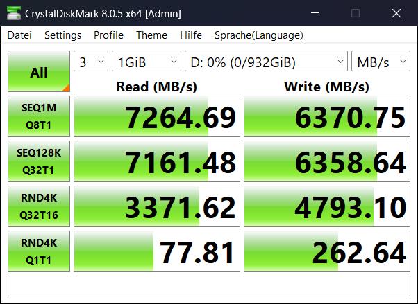 Die erste Leistungsmessung nehmen wir mit CrystalDiskMark vor. Hier erreicht die SSD bei sequenziellen Lesen mit knapp 7.265 MB/s die vom Hersteller angegebene Lesegeschwindigkeit von 7.300 MB/s. Bei der Schreibgeschwindigkeit sieht dies ähnlich aus, denn mit 6.370 MB/s liegt die Geschwindigkeit rund 230 MB/s unter der Angabe des Herstellers. Dabei handelt es sich um Werte, die sich im Durchschnitt aus mehreren Durchläufen ergeben. Insgesamt ist diese SSD trotzdem sehr flott.