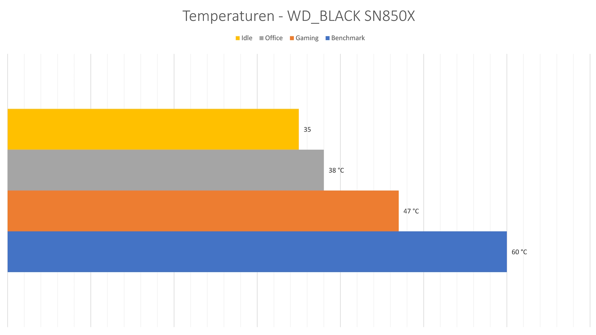 Aus Erfahrungen, welche wir bisher mit diesem Mainboard gemacht haben, wissen wir, dass sich die Lüftergeschwindigkeit kaum auf die Temperaturen des SSD auswirken. Zumindest wenn der SSD-Kühler des Mainboards verwendet wird. Während des folgenden Tests liegt die Zimmertemperatur bei 23 °C und die Lüfter werden mit einer Leistung von 30 % betrieben. Die Temperatur im Idle entnehmen wir der Software HWInfo oder CrystalDiskInfo. Wir schalten den Rechner ein und messen nach 15 Minuten im Idle eine Temperatur von rund 35 °C. Dies ändert sich im Office Betrieb mit einigen Speicherzugriffen auf 38 °C. Richtige Sprünge macht die Temperatur dann erst im Gaming Betrieb. Bei Games wie „The Witcher 3“ und „Cyberpunk 2077“ stellen wir Temperaturen um die 47 °C fest – es kommt auch hin und wieder zu Spitzen auf 53 °C, was aber unkritisch ist. Im Härtetest mit neun CrystalDiskMark Durchläufen erreichen wir eine durchschnittliche Temperatur von 60 °C. Dabei kommt es vereinzelt zu Temperaturen von kurzzeitig 69 °C. Bei diesen von uns gemessenen Temperaturen können wir keine Drosselung der Leistung feststellen.