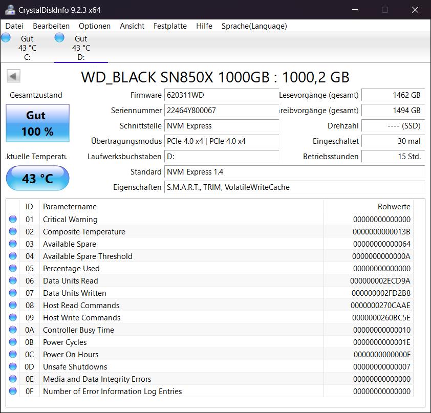 Nun schauen wir uns an, ob die SSD korrekt angeschlossen ist und ob es eventuell irgendwelche Probleme geben könnte. CrystalDiskInfo ist hier eine gute Hilfe und attestiert der SSD an dieser Stelle einen guten Zustand und zeigt dabei auch an, dass die SSD korrekt angeschlossen ist.