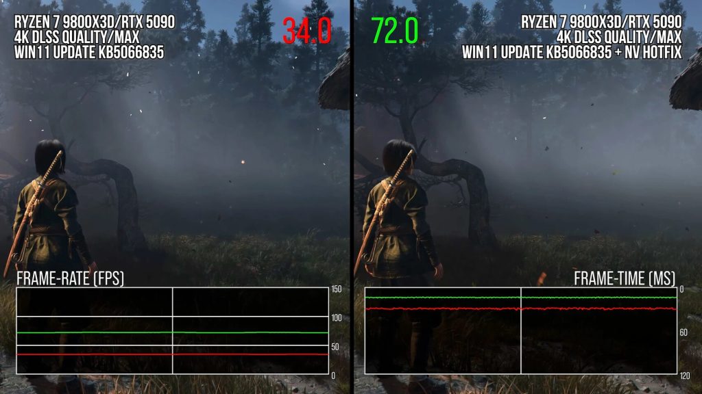 Bei 4K-Auflösung, maximalen Einstellungen und DLSS auf „Quality“ erreichte Assassin’s Creed Shadows auf einem AMD Ryzen 7800X3D und einer NVIDIA GeForce RTX 5090 vor dem NVIDIA-Treiber-Patch lediglich FPS, nach dem Update jedoch 72 FPS.