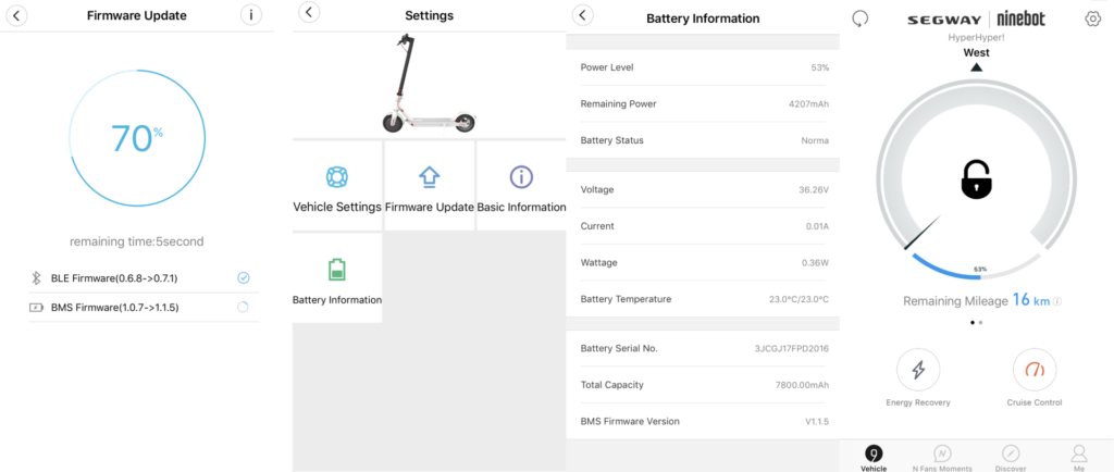 Mit der offiziellen Ninebot App (iOS & Android) kann man sich über Bluetooth mit dem Xiaomi M365 verbinden. Die App bietet eine Übersicht über die Zustände des Rollers, etwa Akkustand, Restreichweite und aktuelle Geschwindigkeit. Aber auch der Stromsparmodus und eine Art Wegfahrsperre sowie die Beleuchtung lassen sich über die App aktivieren. Der Umfang der App wird stetig erweitert.
