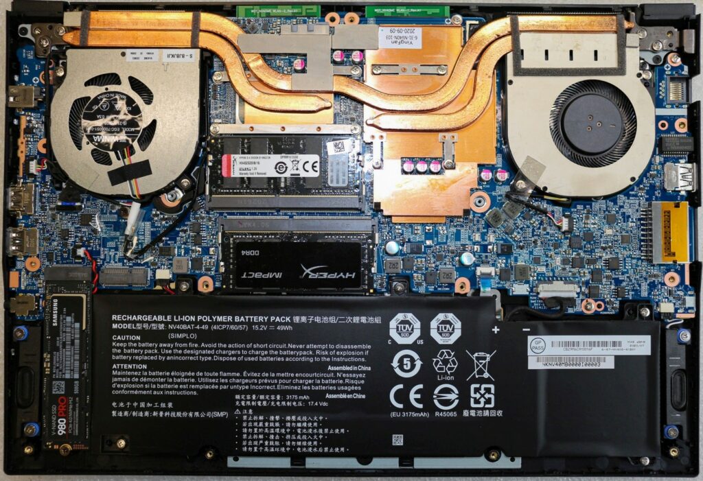 Auch die für ein 14-Zoll-Gerät reichhaltige Auswahl an externen Schnittstellen unterstreicht das Allrounder-Konzept. Das Angebot umfasst Thunderbolt 4 mit Power-Delivery- und DisplayPort-Funktion, einen Gigabit-Ethernet- sowie HDMI-2.0-Steckplatz, USB-C 3.2 Gen2 und zweimal USB-A 3.2 Gen1, einen SD-Kartenleser im Vollformat und einen 2-in-1-Audioanschluss. Der kabellose Netzwerkverkehr läuft über ein schnelles WiFi-6-Modul. Aufgrund der Power-Delivery-Funktion des Thunderbolt-4-Ports bietet der Laptop zwei unterschiedliche Auflademöglichkeiten: Klassisch über das beiliegende Netzteil mit Hohlstecker oder alternativ über einen optionalen USB-C-Stromspender. Der Einsatz der äußerst energieeffizienten Tiger-Lake-Prozessoren (28 W) und der GeForce GTX 1650 Max-P (50 Watt) erlaubt es, den Laptop selbst im Lastbetrieb vollständig über USB-C zu laden – ein 90 Watt starkes Universalnetzteil vorausgesetzt.