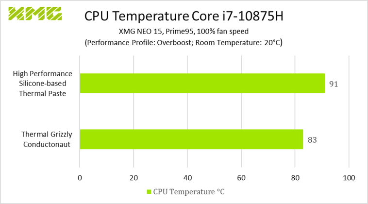 Bereits die bisherigen XMG NEO-Laptops verwendeten ein Flüssigmetall-basiertes Wärmeleitmittel, um selbst unter kontinuierlicher Dauerlast die bestmöglichen Prozessortemperaturen sowie einen geräuschoptimierten Betrieb zu gewährleisten. Allerdings hielt sich XMG bislang bezüglich der Nennung des Herstellers zurück. Mit der Vorstellung des XMG NEO mit Achtkern-Prozessoren wird das Unternehmen konkreter und kommuniziert den Einsatz von Thermal Grizzlys Conductonaut. Selbst im Vergleich zu hochwertigen Silikon-Wärmeleitpasten ist das Flüssigmetall in der Lage, die Prozessortemperatur unter Volllast nochmals deutlich zu reduzieren: In Prime95-Stresstest konnte die maximale CPU-Temperatur eines Intel Core i7-10875H im XMG NEO 15 von 91 auf 83 °C gesenkt werden. Die Ergebnisse und Messwertabstände können jedoch wie üblich für jede einzelne CPU unterschiedlich ausfallen.