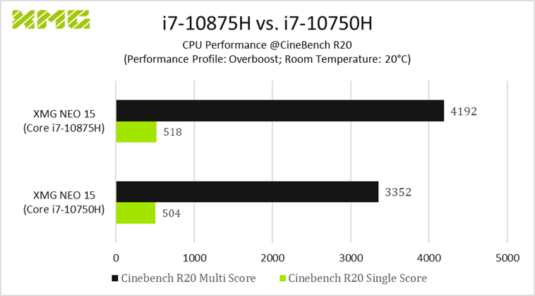 Verrichtete in XMGs NEO-Laptops bislang ausschließlich ein Intel Core i7-10750H seinen Dienst, steht künftig auch eine Ausstattungsvariante mit zwei zusätzlichen CPU-Kernen zur Verfügung. Der Core i7-10875H bietet acht Kerne, 16 Threads und einen Basis- und Boost-Takt von 2,3 beziehungsweise bis zu 5,1 GHz. Das Upgrade schlägt sich insbesondere in Multicore-optimierten Einsatzbereichen nieder, sorgt aber auch dafür, dass die 15,6 und 17,3 Zoll großen Gaming-Laptops im Hinblick auf kommende Spieletitel leistungsseitig zukunftssicher aufgestellt sind. Im CineBench R20 setzt sich der Core i7-10875H im XMG NEO 15 mit 4.192 Punkten deutlich vom i7-10750H mit 3.352 Punkten ab.