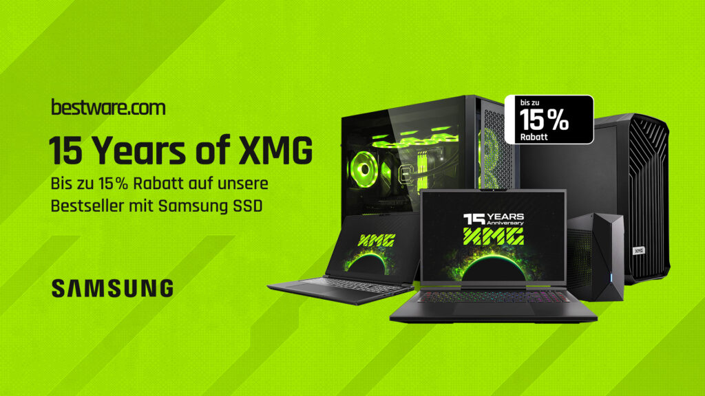 Vom 15. August um 10 Uhr bis zum 29. August um 24 Uhr gilt in XMGs offiziellem Partner-Shop bestware.com das Motto „15 Years of XMG“. Der Preisabzug erfolgt automatisch im Warenkorb und die Aktion auf läuft nur, solange der Vorrat reicht. Voraussetzung für den Rabatt ist die Auswahl einer SSD von Samsung im Laptop-Konfigurator.