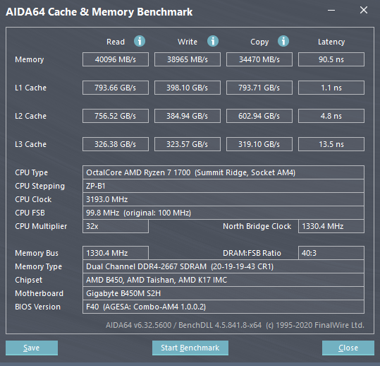 Betrachten wir die Benchmarkergebnisse, welche wir mit unserem AMD-System erhalten haben, erkennen wir, dass wir mit einem Gigabyte B450M S2H-Board eine Lesegeschwindigkeit von 40096 MB/s und eine Schreibgeschwindigkeit von 38965 MB/s erreichen. Die Latenzzeit beträgt 90,5 ns.